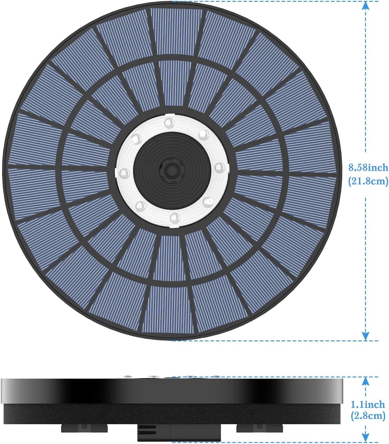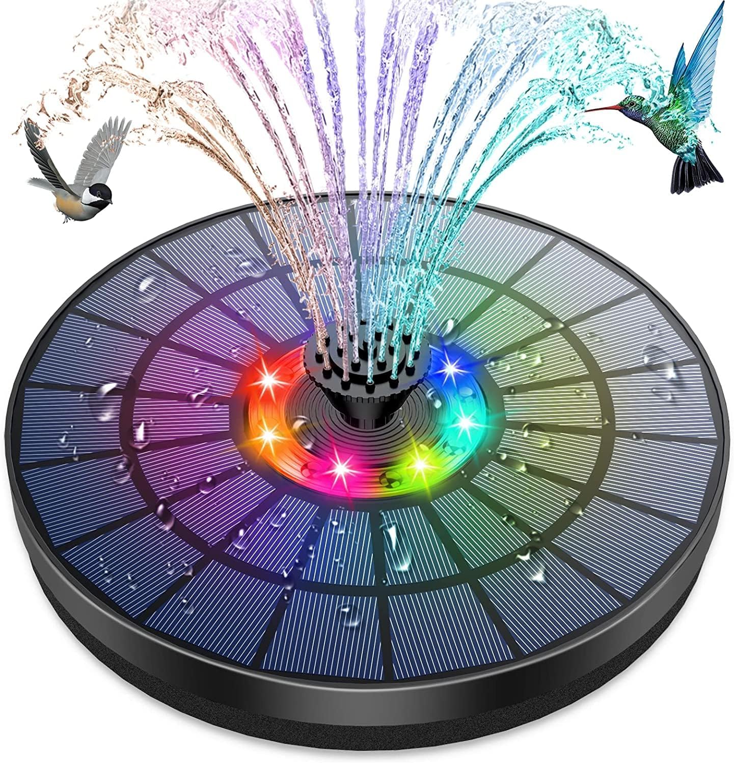 【8 Colorful LED】Solar Fountain Pump has a built-in 2000mAh battery and 8 LED lights, that stores electricity in direct sunlight during the day, which operates at night by automatically detecting the light intensity at night through a light-sensing system. Each different coloured LED switches randomly to display a colourful and unique water feature. LED light Takes 1-2 minutes to come on. Suitable for bird ponds, fish tanks, small ponds, swimming pools and garden decoration.