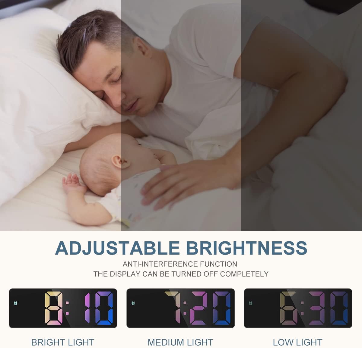 ⏰ 【Adjustable Brightness】Just press UP/DOWN to adjust the three levels of brightness (Bright/ Medium /Low). Besides, the bedside alarm clock will auto dim during 18:00-6:00 when in the night mode, or you can set another periods of time for your need. Just press and hold the snooze button for more than 3 seconds to turn off the display to prevent the screen from lighting up at night to interfere with sleep. (NOTE: If you use a cable for power supply, the clock will always be on.)
