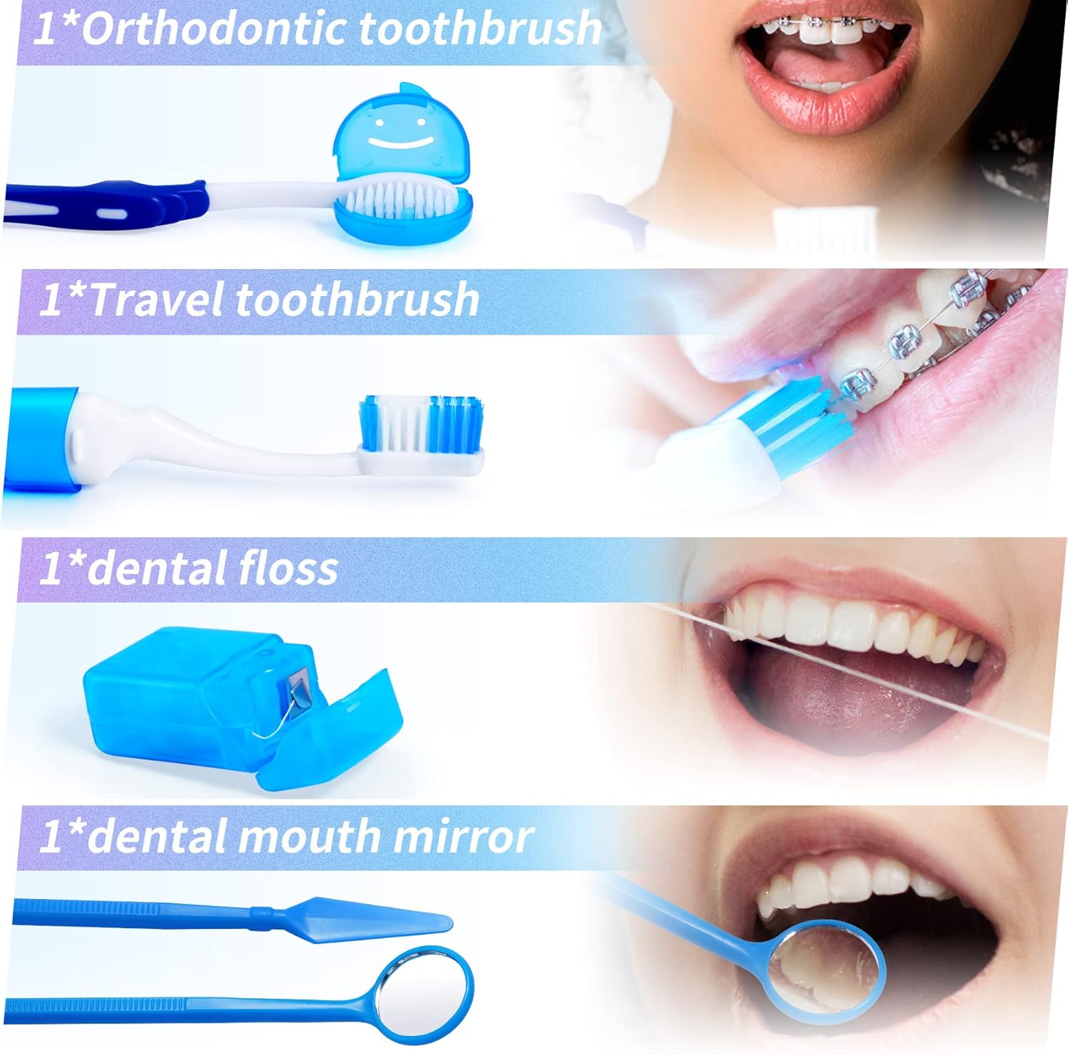 ✅ What You Can Get: 1*Orthodontic toothbrush, 1*travel toothbrush, 1*dental mouth mirror, 1*braces wax, 1*interdental brush, 1* hourglass timer, 1*dental floss threaders, 1*dental floss .