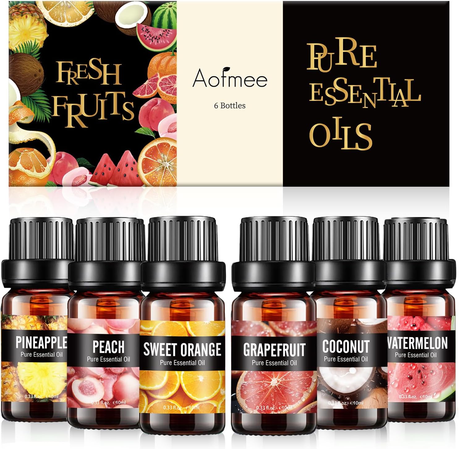 Aofmee Fruity Essential Oil Set, 6 x 10ml Essential Oils for Diffuser, Humidifier, Home Fragrance Oil for Soap, DIY Candle Making Scents, Cleaning, Premium Aromatherapy Oils for Sleep