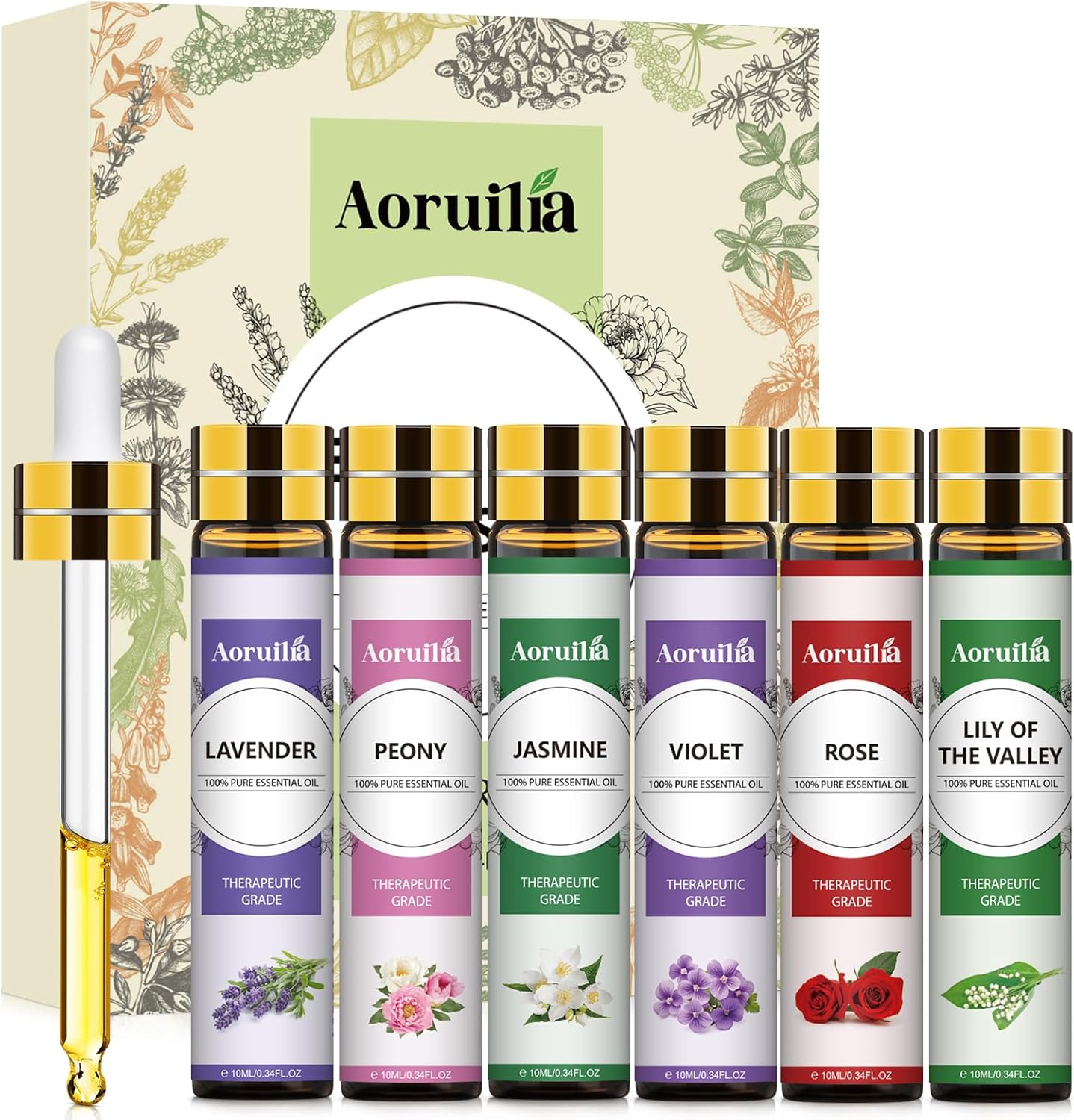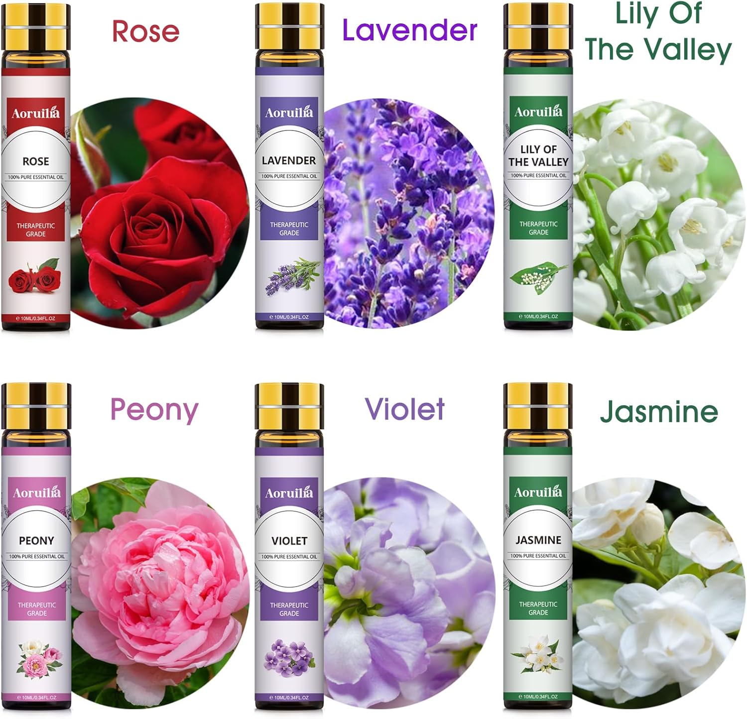 Aoruilia 6 x 10ml Floral Essential Oils Set, 100% Pure Essential Oil for Diffuser for Home Fragrance, Aromatherapy, Perfume, Candle Making – Rose, Lavender, Jasmine, Lily of The Valley, Peony, Violet
