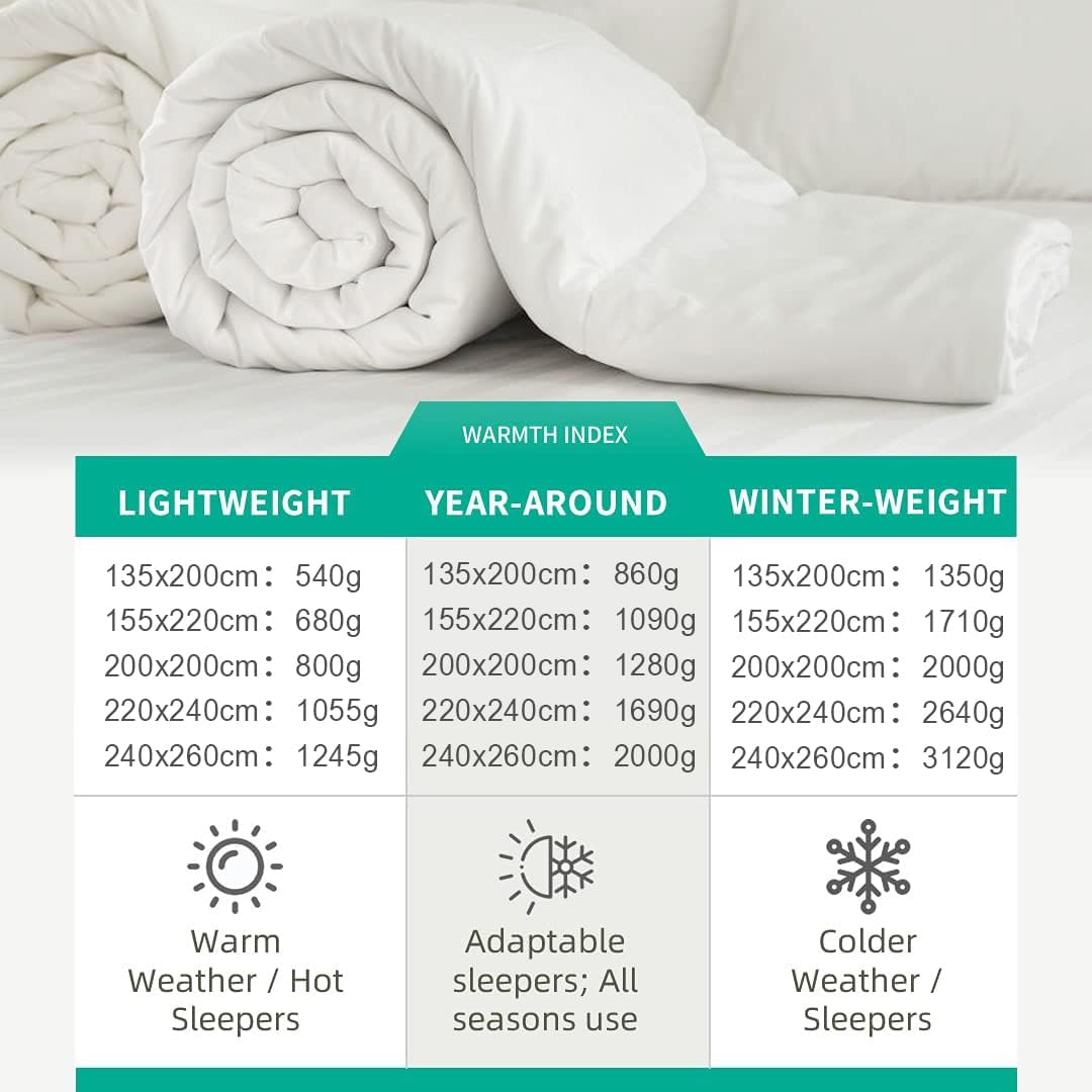 𝐘𝐄𝐀𝐑-𝐀𝐑𝐎𝐔𝐍𝐃 𝐂𝐎𝐌𝐅𝐎𝐑𝐓𝐄𝐑 — The feather down duvet 220 x 240 cm is 1690 g filling weight and 320 g/m² ensures the right sleeping climate. The ideal down duvet 220 x 240 for the whole year is medium weight and can provide medium warmth, regardless of summer, autumn, spring or winter night.