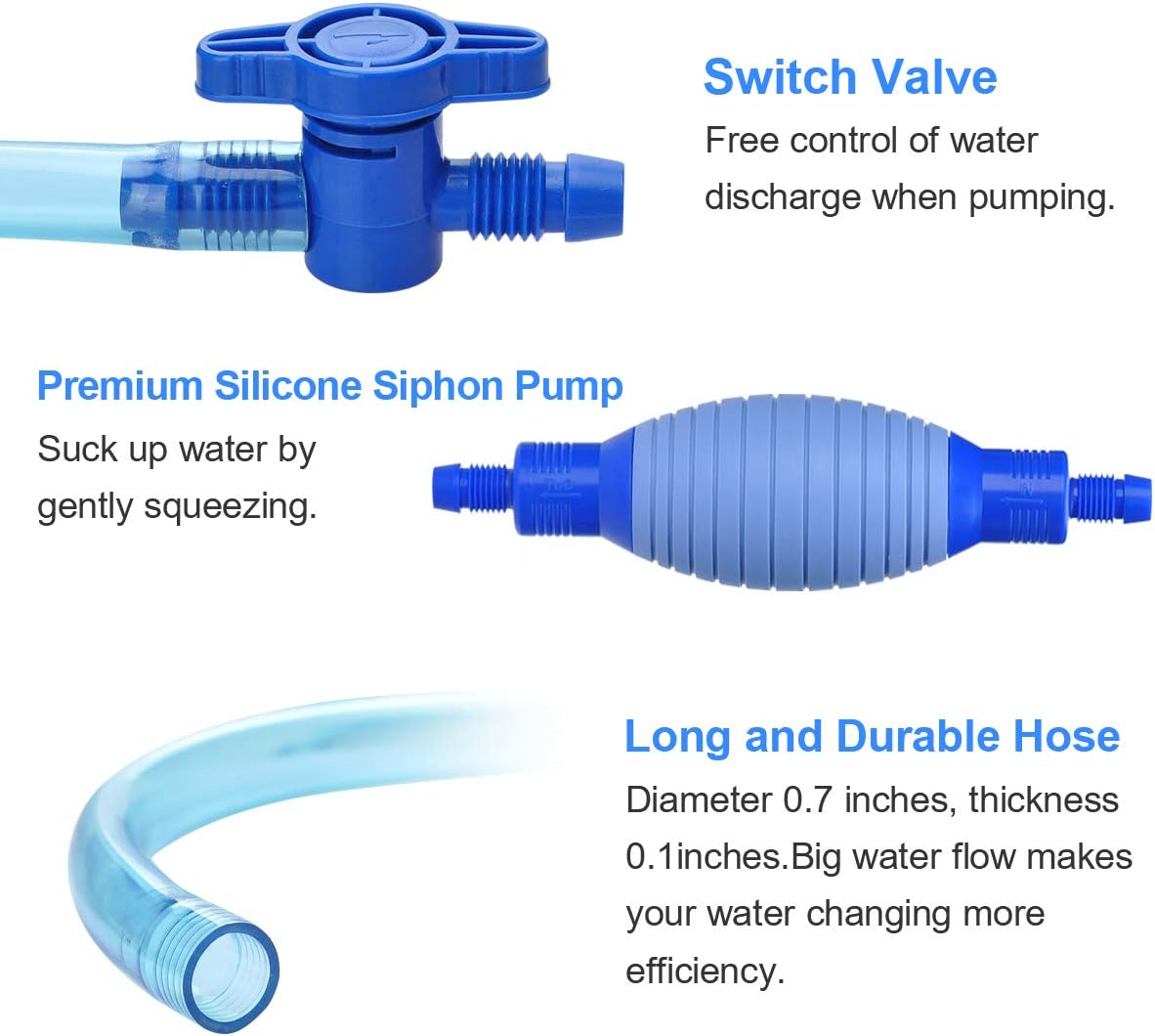 It is easy to use,just need to put water inlet into the fish tank and put the outlet into a bucket,turn on the faucet,and then squeeze the siphon pump until water flows out automatically.You can lower the water inlet to help clean fish manure or feed residue.NOTE: Please keep the water outlet lower than the inlet,let the water can flow out automatically.
