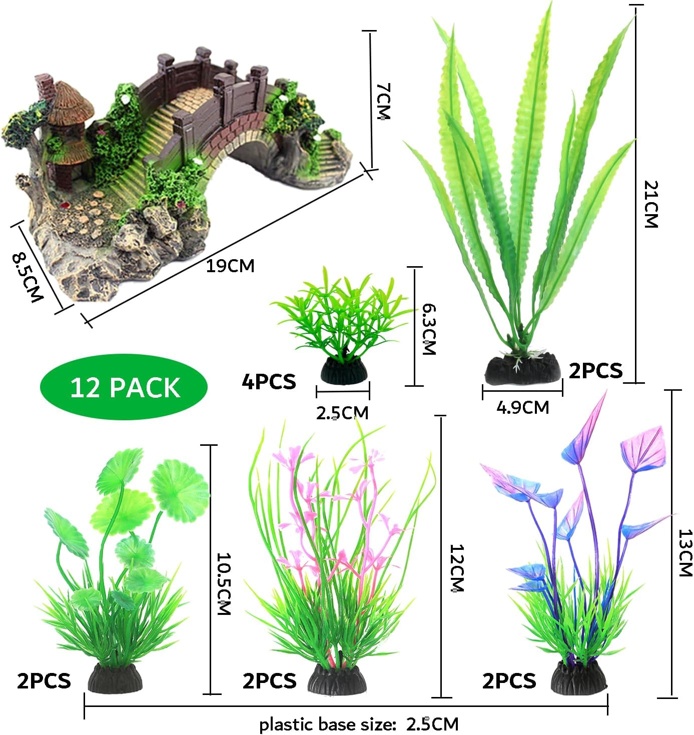 Package Includes: 1 pieces Resin Arch Bridge and 12 Pieces assorted heights green plastic artificial aquarium plants to aid in landscaping. Plants various Heights 5 to 20 cm. Aquarium Decorative Bridge size: 19×8.5x7CM. This set would fits 5-15 gallon and up aquarium nicely.