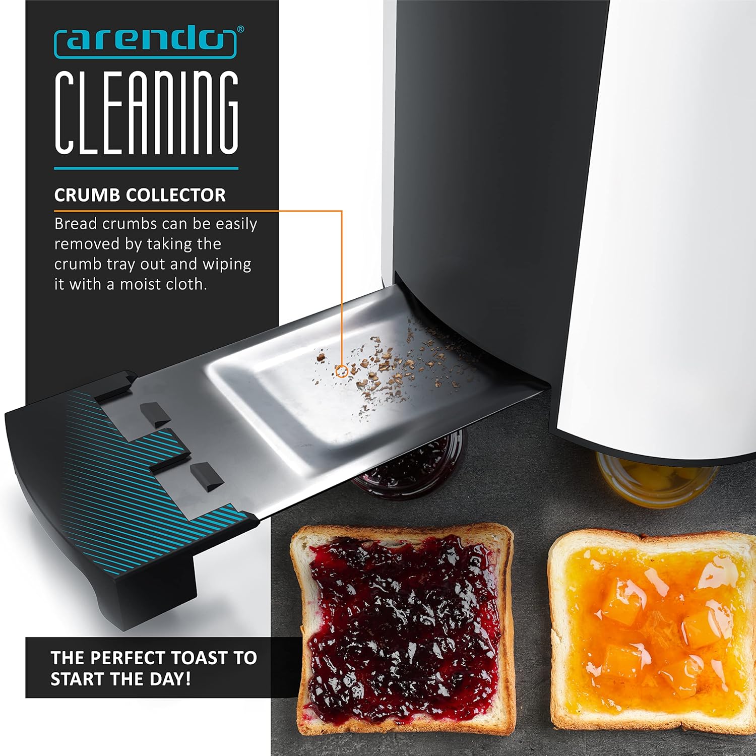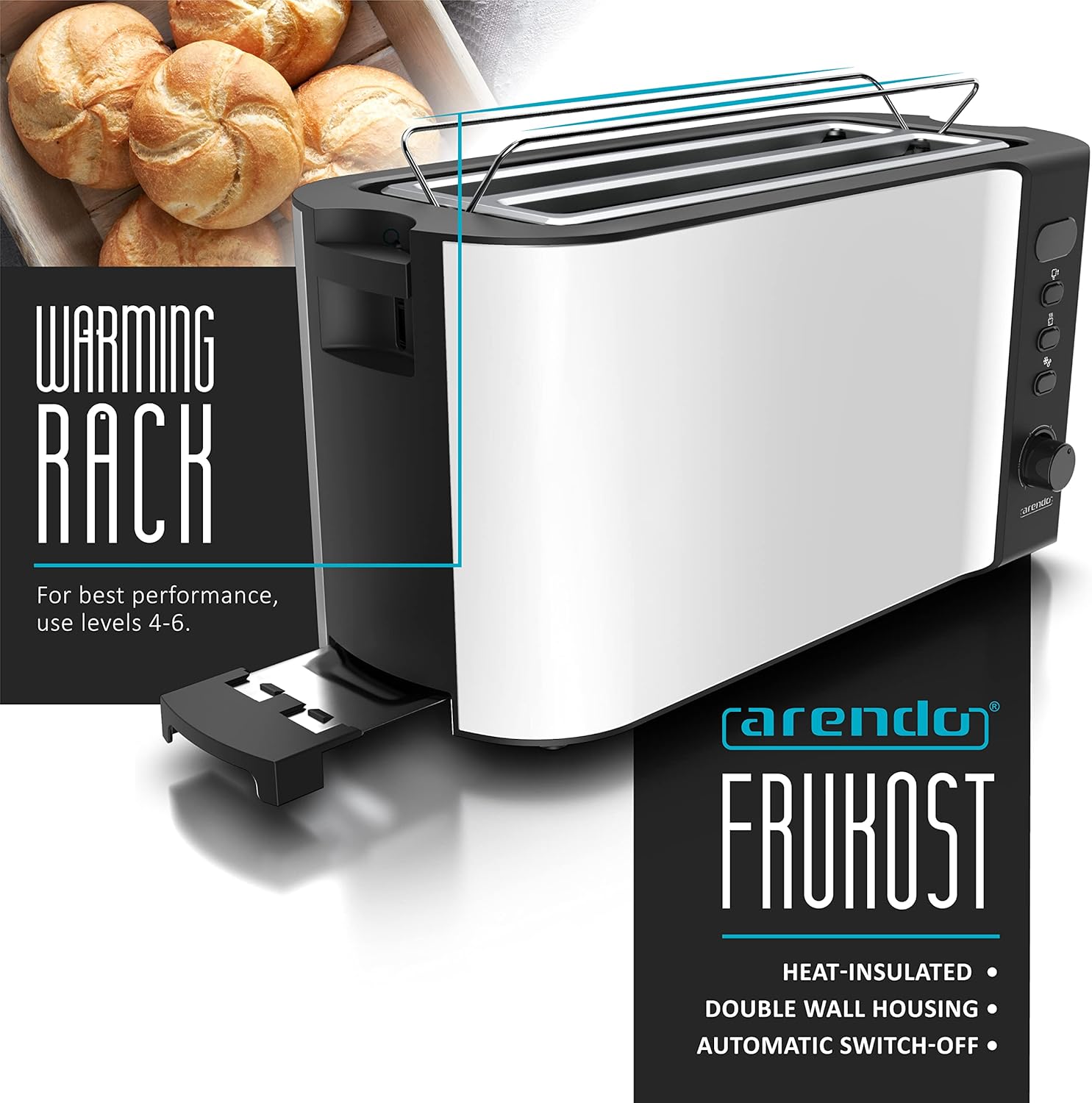 Whether baguettes, bagels, rolls, croissants or thick and thin slices of bread – Arendo high-quality stainless-steel toaster browns up to 4 slices. The defrost function makes it possible to quickly toast frozen bread. In addition to that, the reheat function warms up toasted bread at the touch of a button. The removable crumb tray provides uncomplicated and quick cleaning.
