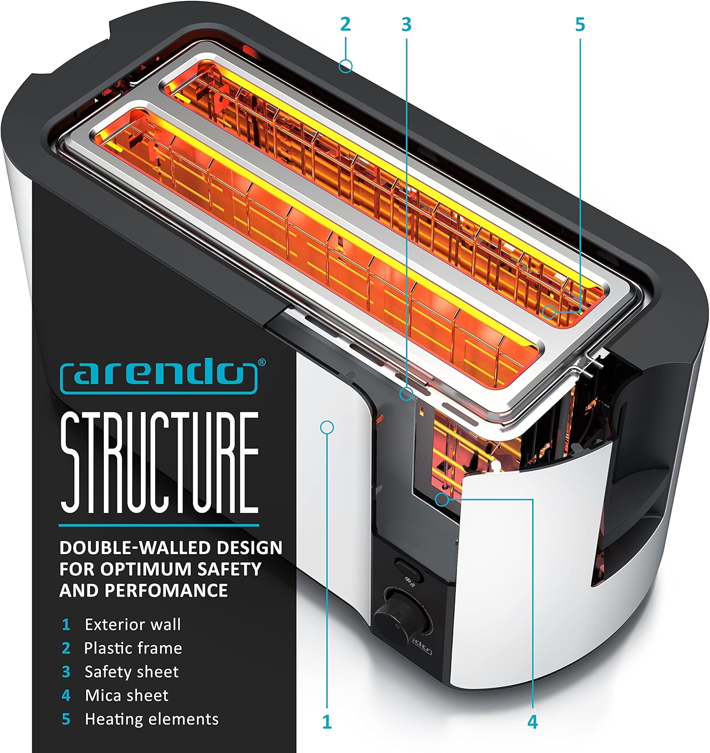 Arendo – Frukost 4 slice long slot toaster – double wall housing – with warming rack – 6 browning settings – auto bread centring – reheat defrost cancel function – remaining time display