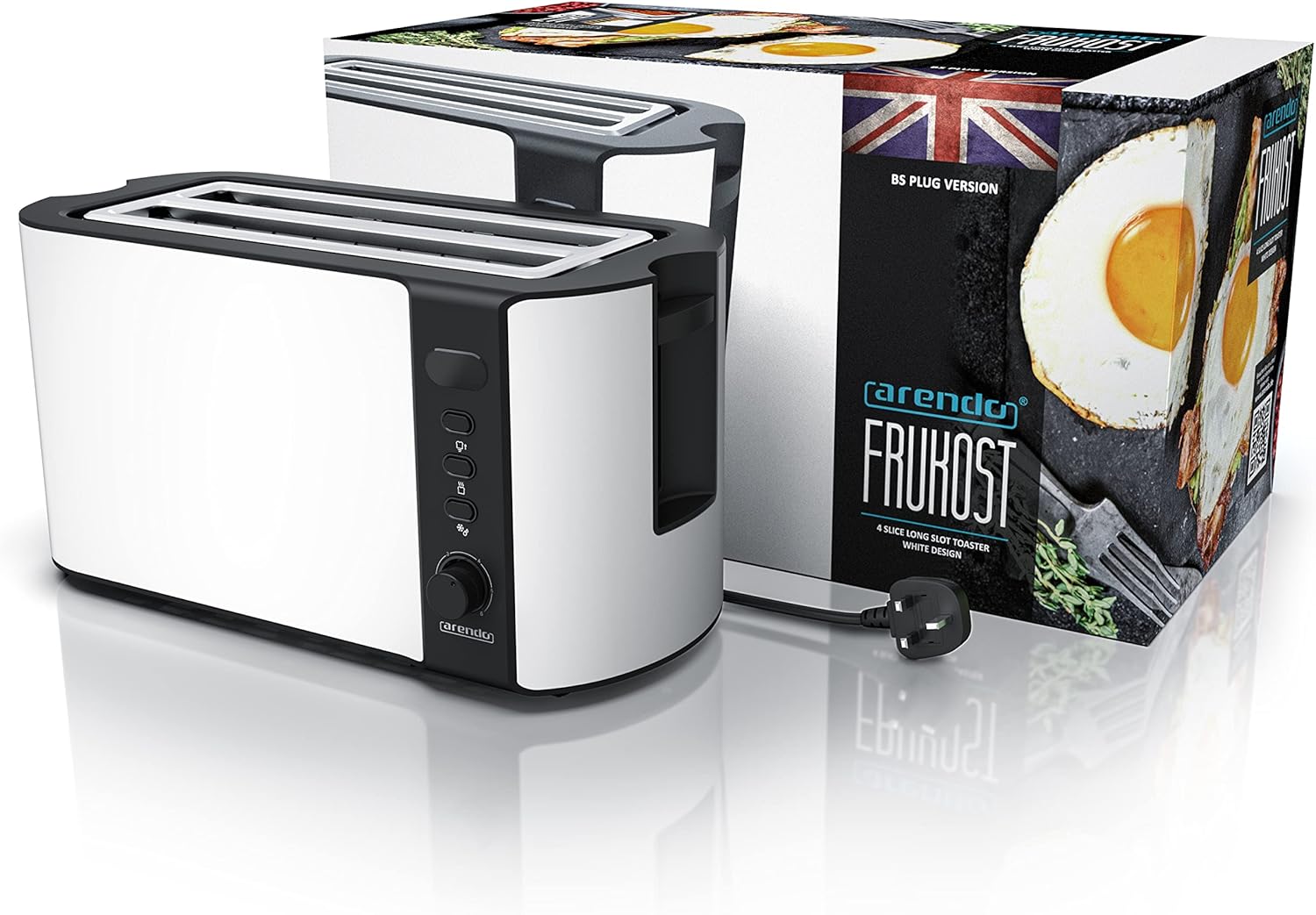 Dimensions (without warming rack), H x W x L: 19,5 x 38,5 x 19 cm | Cable length: 88 cm /Cable diameter: 6 mm | Weight: g | Material: Plastic and brushed stainless steel | Colour: Steel | Scope of Delivery: Arendo Frukost 4 -slice stainless steel long slot toaster + user manual (ENG,GER,FRA,ITA,ESP) NB: 4 Slices : Our toasters are optimized for the use of the two standard sizes commonly used: American Sandwich Toast: 11,0 x 11,0 x 1,2 cm Regular Toast: 9,0 x 9,5 x 1,3 cm