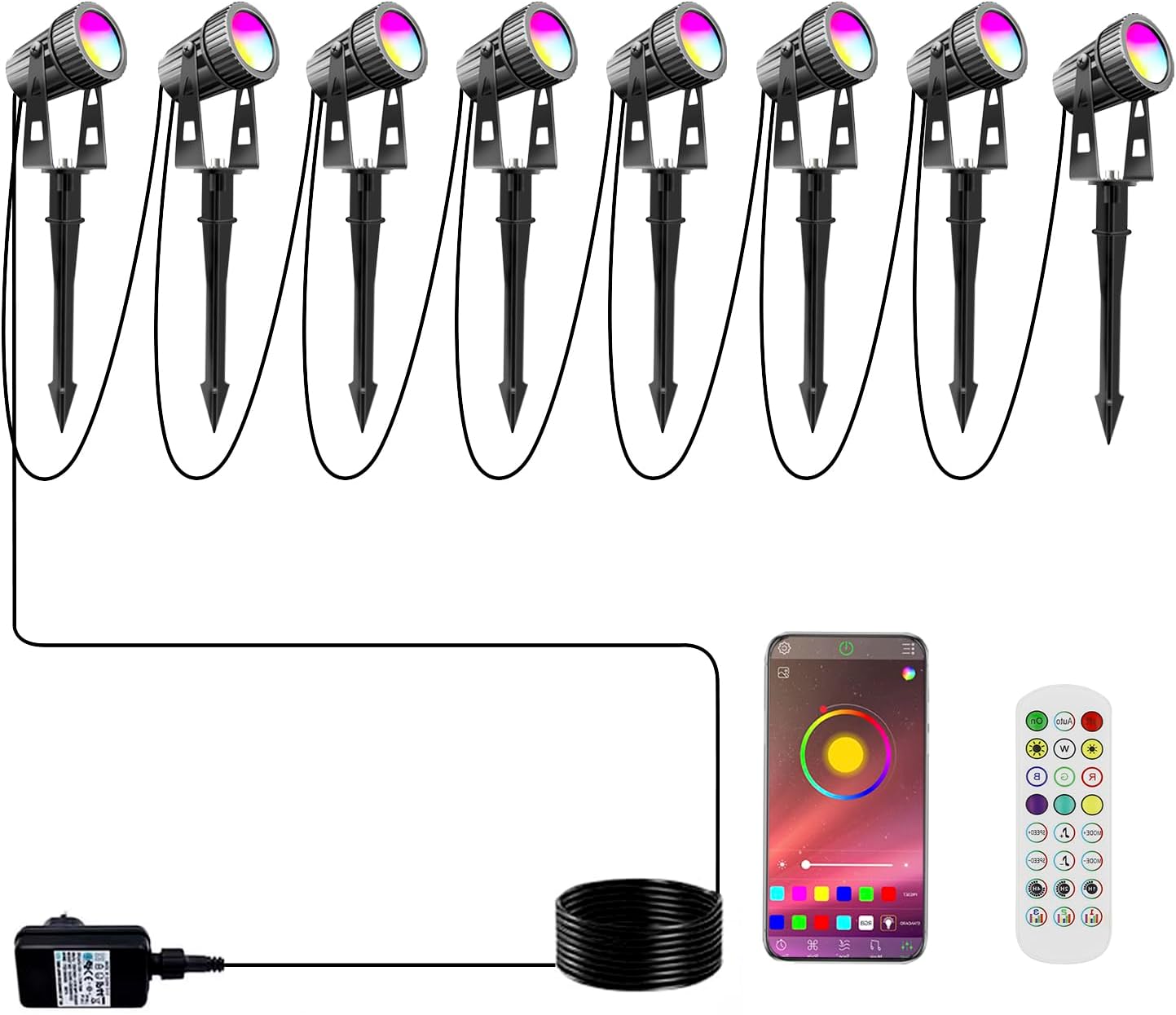 Package Content 8 x Landscape Spotlights 1 x 12V Adapter 1 x Remote Control 8 x Spike Stand 1 x instructions