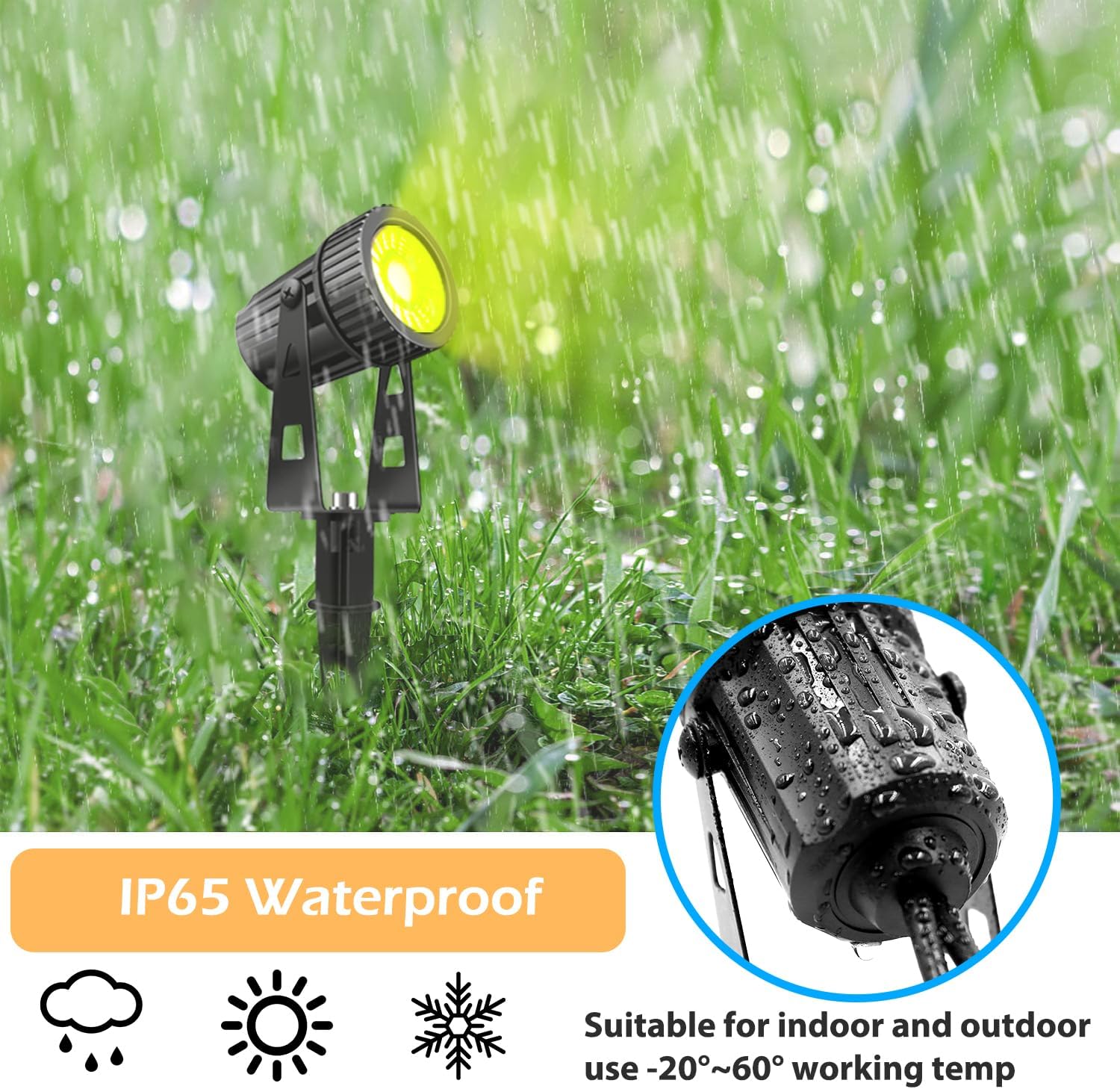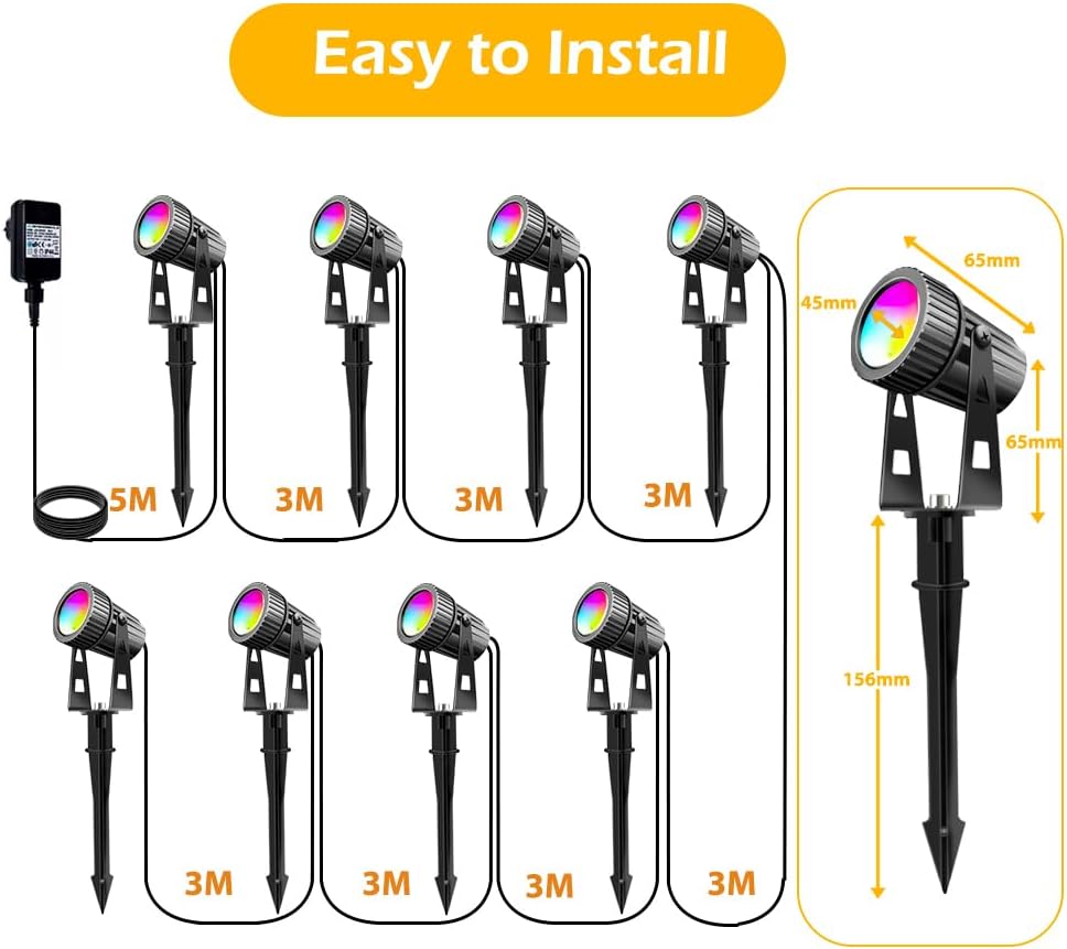 1.High Quality COB LED Spotlights: total power 24W, 2100LM, RGB with warm white 3000K-3200K, brighter and more stable than standard LED chips. The garden light is adjustable in 270 degrees. IP65 waterproof, durable and rustproof. Meet your daily life and holiday decorating needs.