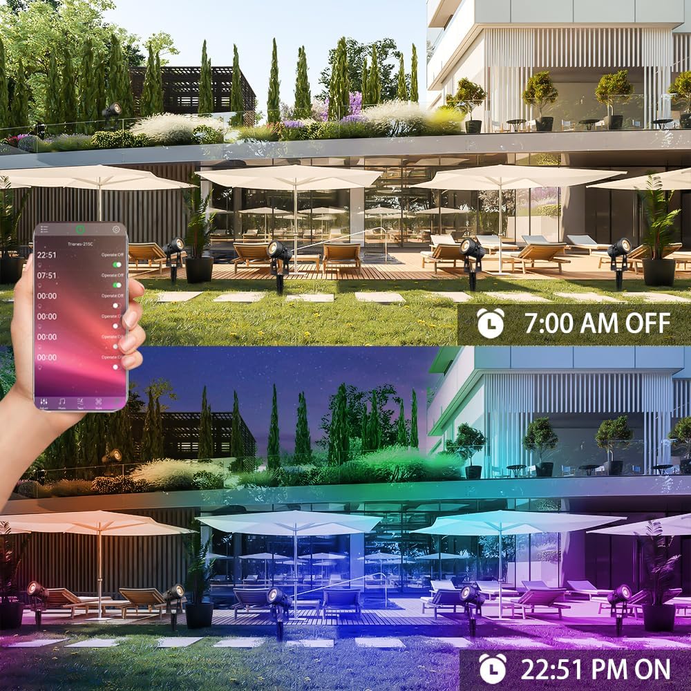 2.Memory & Timer Function: The outdoor landscape light has built in memory function, when you turn on the light again, it will keep the final lighting mode. With the timer function, you can automatically turn on or off the lights by setting the time in the App.