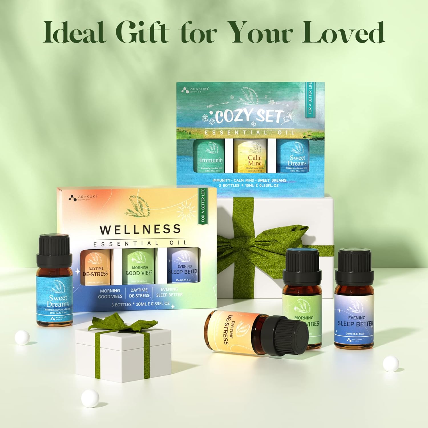 ASAKUKI Wellness Essential Oils Gift Set – 100% Pure Aromatherapy Diffuser Blends Oils, Therapeutic Grade, Help for Uplift Mind, Calm Stress & Anxiety, Allay Tiredness, Sleep Better – 3 * 10mL