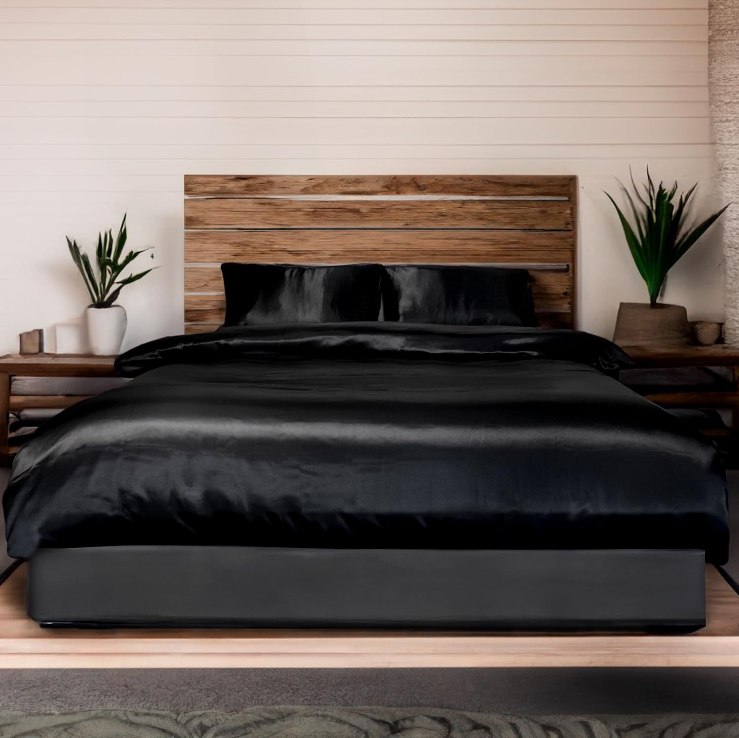 Augustus Group AG – Double Size Black Satin Silk Luxurious Bedding Set with Double Duvet Cover and Envelope Style Pillowcases – Luxury Soft, Hotel Quality Double Bedding Set