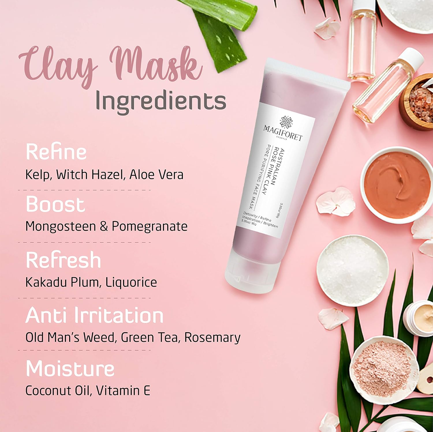 Australian Pink Clay Mask, MagiForet Clay Mask, Exfoliating Facial Mask, Acne Treatment Brighten Skin Minimize Pores, For Oily, Combination, Sensitive Skin, Blackheads, Vegan Formula