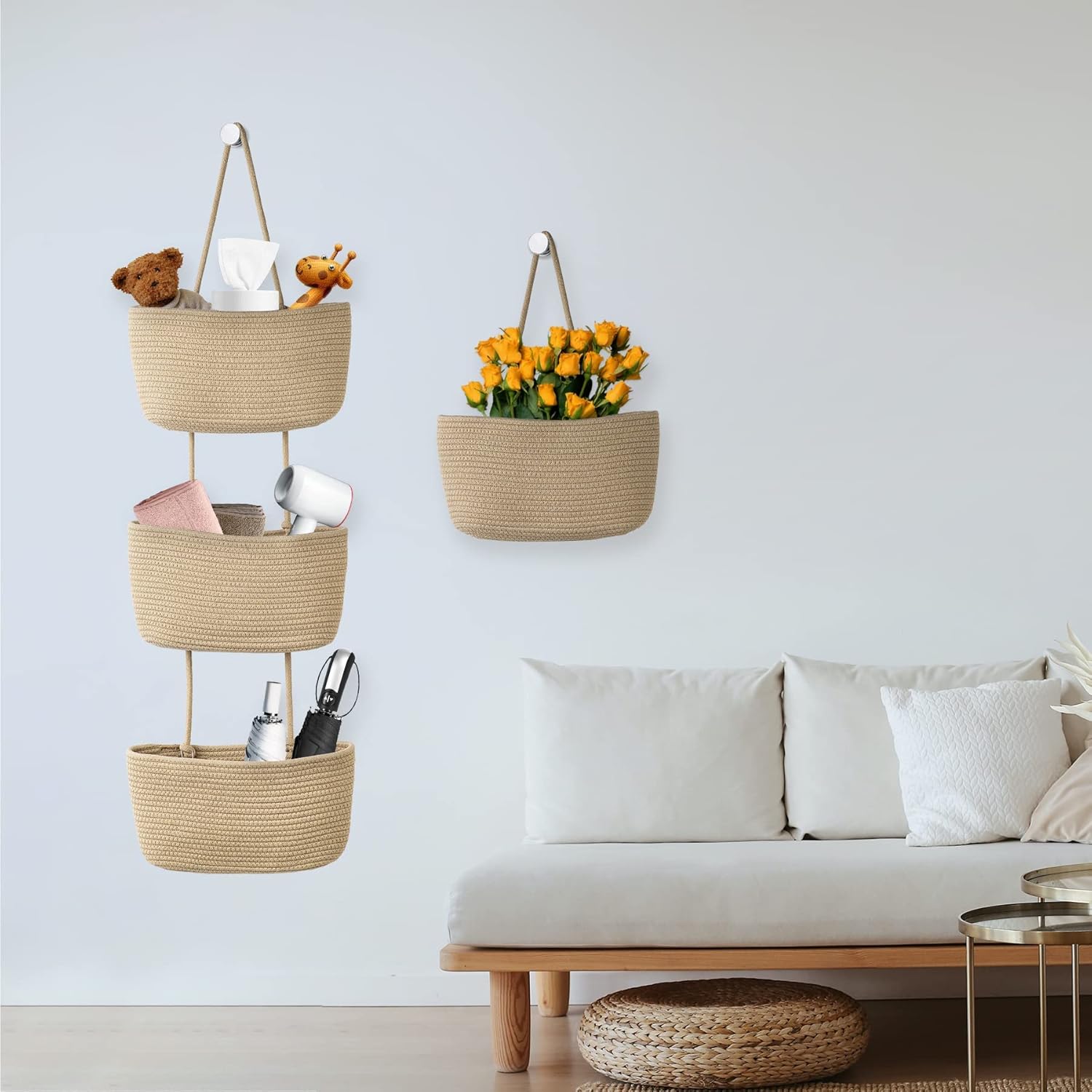★High-Quality Material: The hanging wall organiser is made of handcrafted meticulously with natural, sustainable 100% cotton woven thread rope. This hanging shelves storage is soft to the touch, free of harmful substances, can be safely stored anywhere, and has a sturdy construction for multiple uses.
