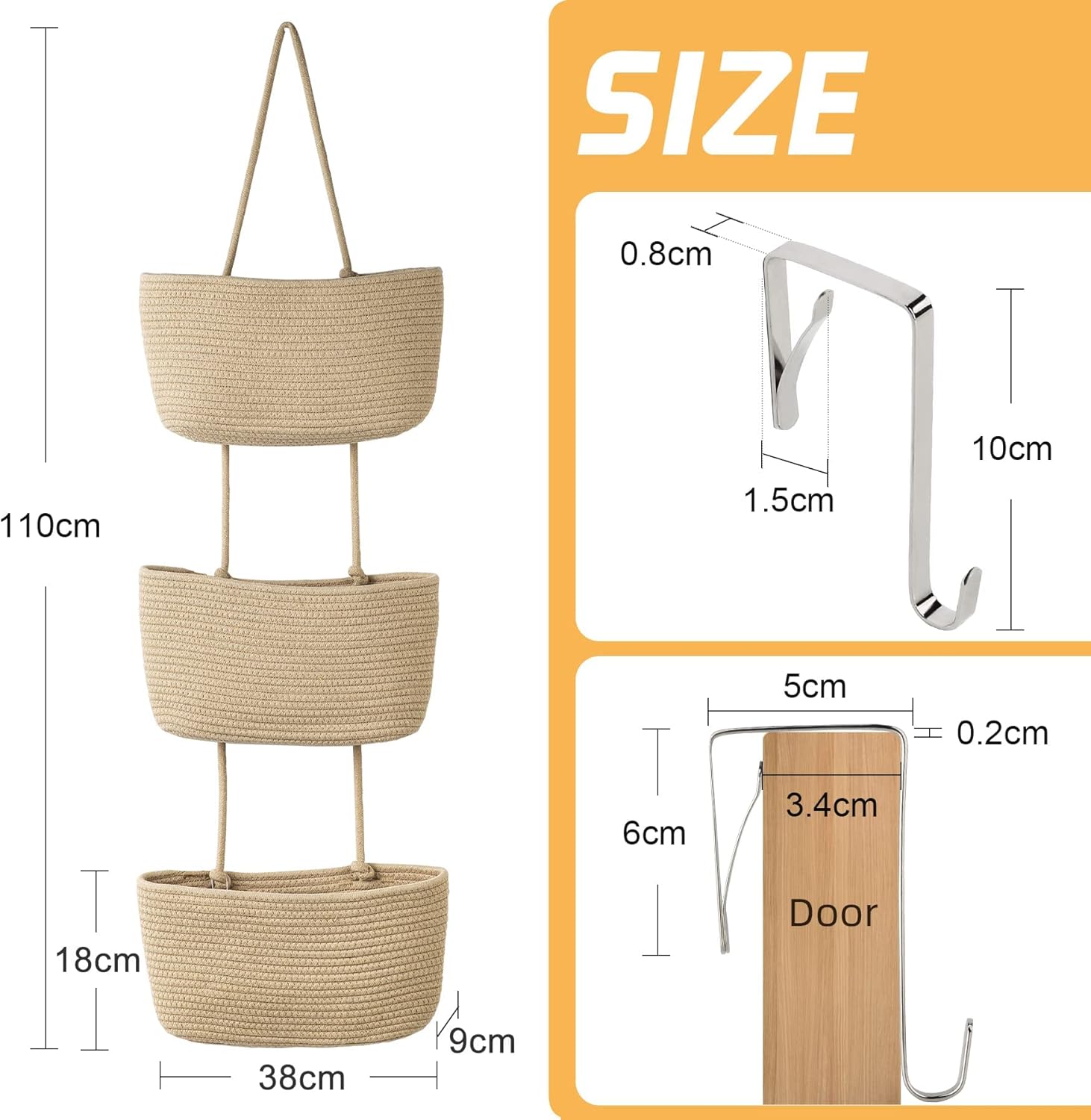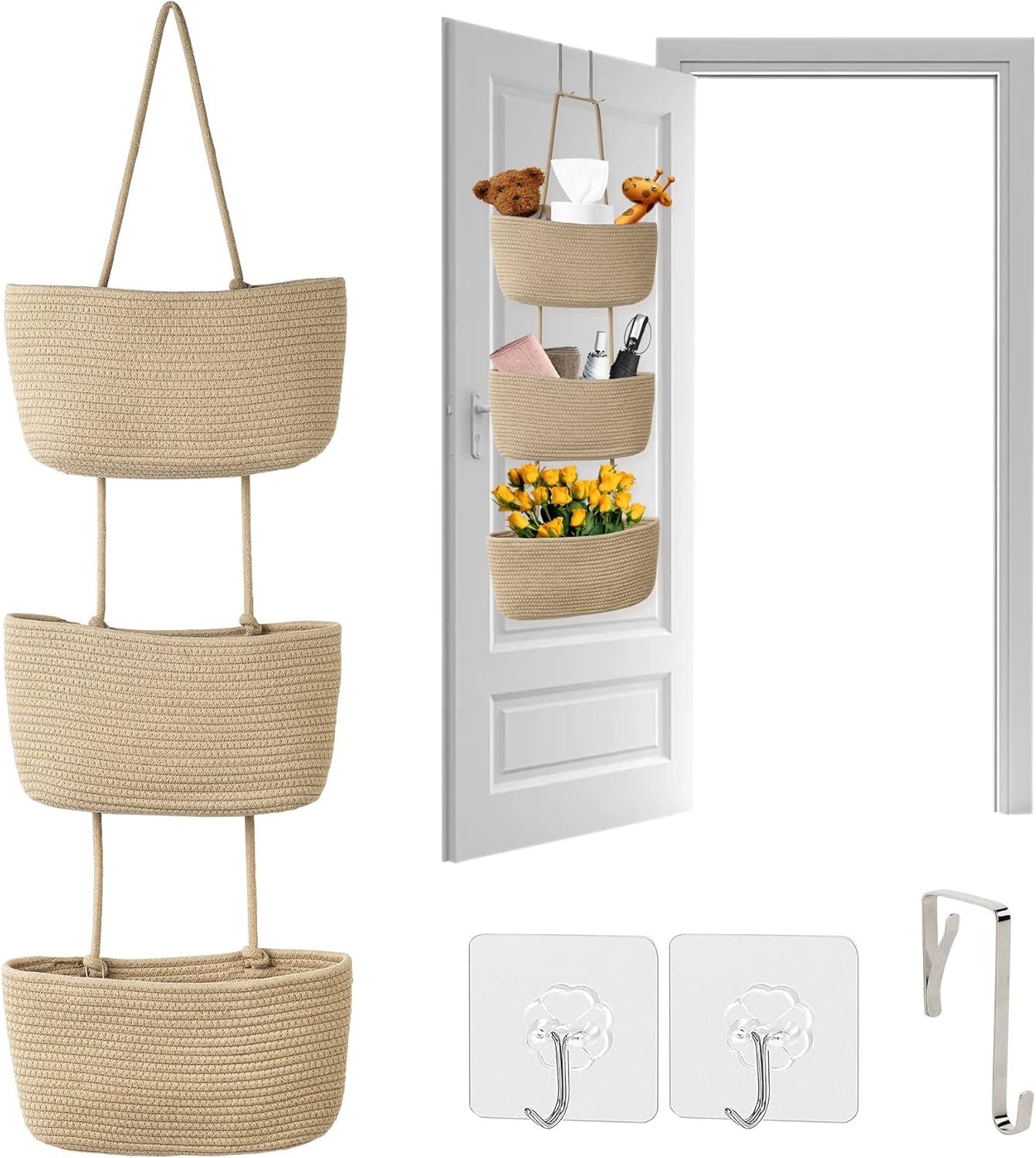 Autumnlife 3-Tier Over Door Storage Organiser, Woven Rope Over the Door Storage Wall Mount Hanging Storage Cotton Fabric Back of Door Storage for Bedroom, Bathroom, Nursery – Brown