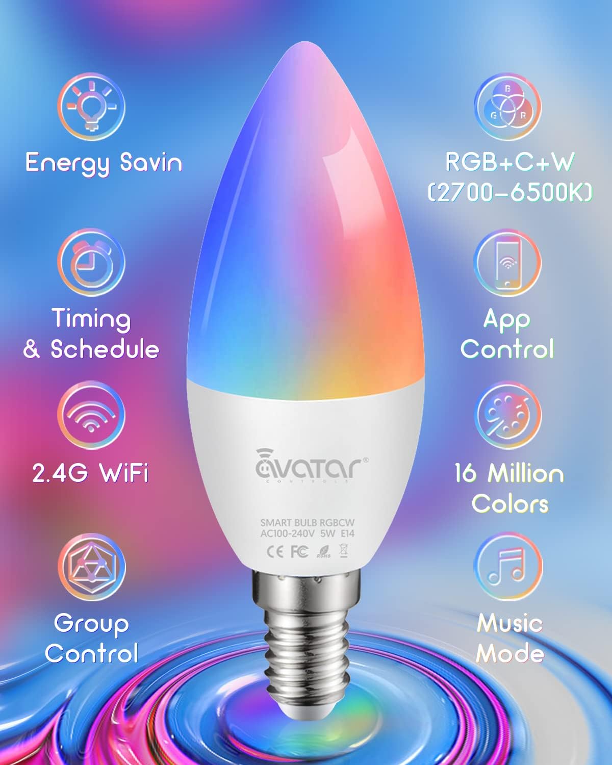 Avatar Controls Smart Bulb E14 Light WiFi LED Candle Bulbs C37, Music Sync 5W 2700K-6500K RGB+Warm/Cool White Colour Dimmable Compatible with Alexa/Google Home App(Upgraded Connection)