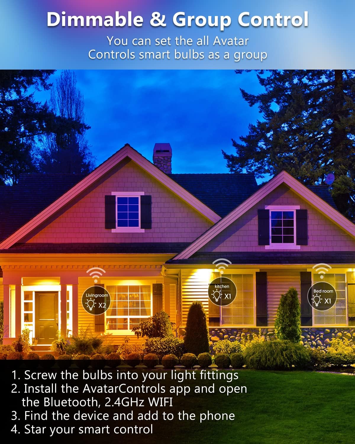 ❤Faster to Install & Control Anywhere❤: Just install the AvatarControls APP, open the Bluetooth and connect to 2.4GHz Wifi, it will find the smart bulb automatically, and start to enjoy smart life, control the bulbs anywhere anytime.(the Bluetooth just use for set up)