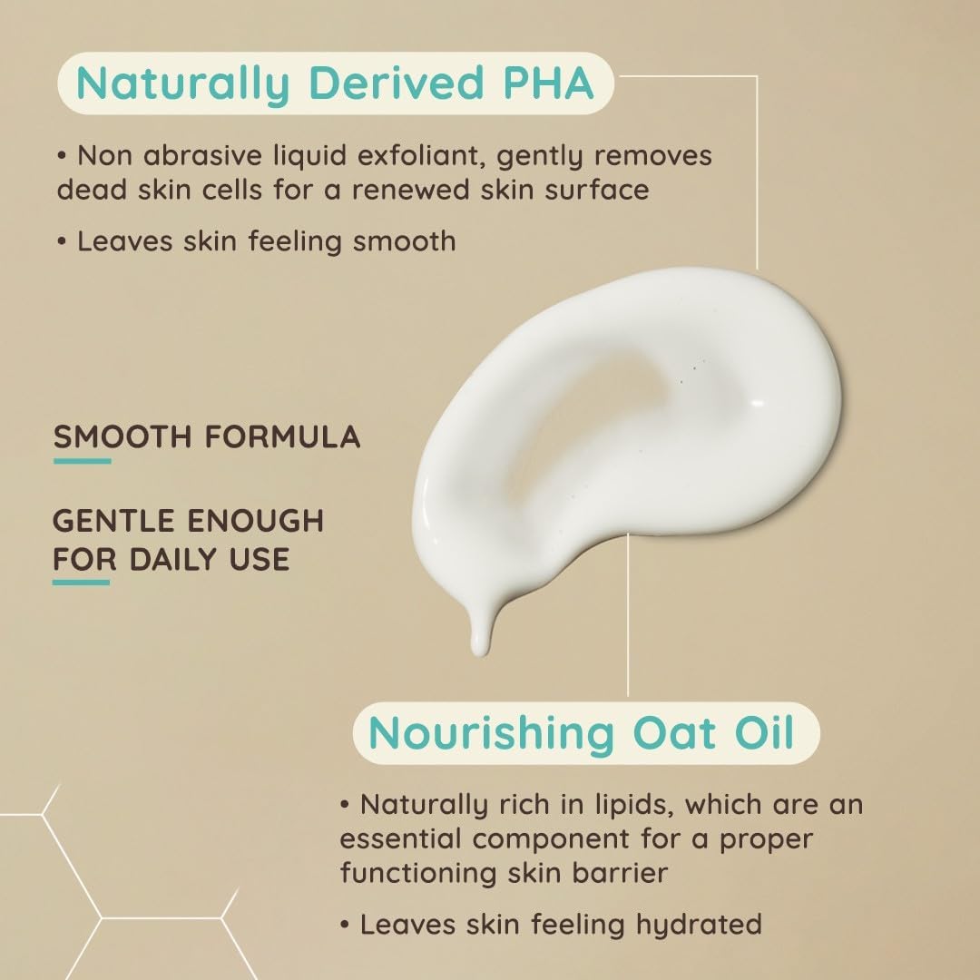 This gentle cleanser and face exfoliator features a non-abrasive formula with PHA to gently exfoliate and cleanse, leaving skin feeling moisturised and smooth. PHA (Polyhydroxy Acid) is a non-abrasive exfoliant suitable for sensitive skin, while Nourishing Oat Oil respects the skin’s natural moisture barrier and leaves skin feeling hydrated. The smooth formula is dermatologist tested and suitable for normal to dry skin. It is fragrance-free, hypoallergenic*, and is gentle enough for daily use.