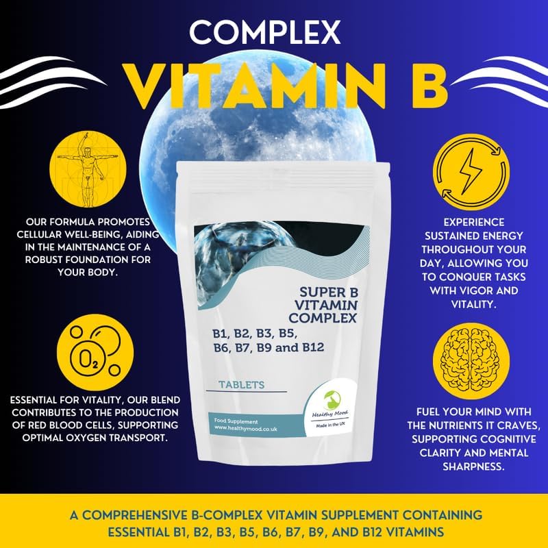 B-complex vitamin capsules contain vitamins B1, B2, B3, B5, B6, B7, B9 and B12. Each B vitamin has an important physiological role in the body. If a person lacks a particular B vitamin, or takes excessive amounts. SUPPLEMENT FACTS: B3 Niacin 16mg (100% NRV), Pantothenic Acid B5 6mg (100% NRV), Vitamin B6 1.4mg (100% NRV), Thiamine (Vitamin B1) 1.1mg (100% NRV), Riboflavin (Vitamin B2) 1.4mg (100% NRV), Vitamin B12 2.5mcg (100% NRV), Folic Acid B9 200mcg (100% NRV), Biotin B7 50mcg (100% NRV). INGREDIENTS: Bulking Agent (Dicalcium Phosphate, Microcrystalline Cellulose), Niacin, Pantothenic Acid (d-Calcium Pantothenate), Anti-Caking Agent (Magnesium Stearate), Vitamin B6 (Pyridoxine Hydrochloride), Riboflavin (Vitamin B2), Thiamine mononitrate (Vitamin B1), Vitamin B12 (as Cyanocobalamin), Folic Acid, Biotin (as d-Biotin). DIRECTIONS: Take one tablet a day. NOTE: Do not exceed the recommended daily intake. Should not be used as a substitute for a varied diet. Always consult a doctor before using any supplements.
