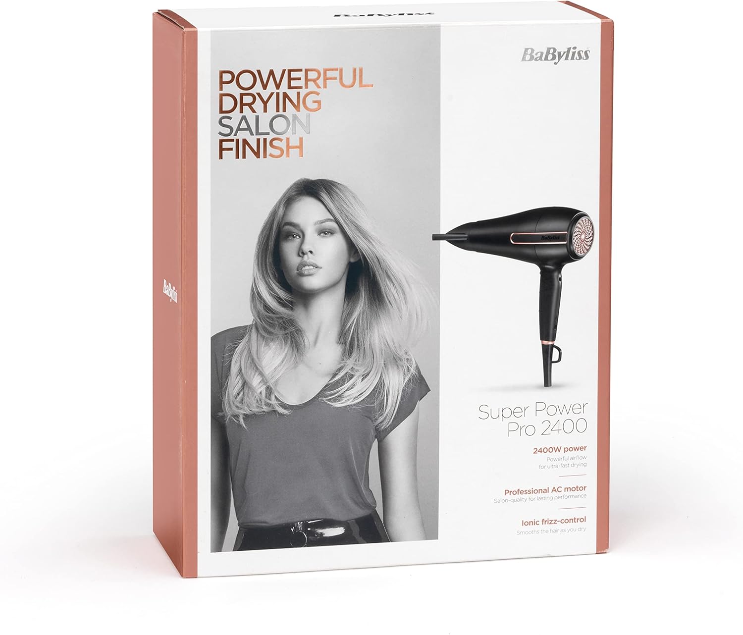 Achieve salon results and finish with this high powered 2400W AC hairdryer. Salon-grade motor built for long-life and lasting performance coupled with powerful airflow for fast drying. Releasing ionic conditioners to smooth the hair as you dry to reduce frizz and boost shine for healthier looking hair. Variable heat and speed settings gives drying control whilst the cold shot button is perfect for setting your style for lasting results.2.5 meter power cord.