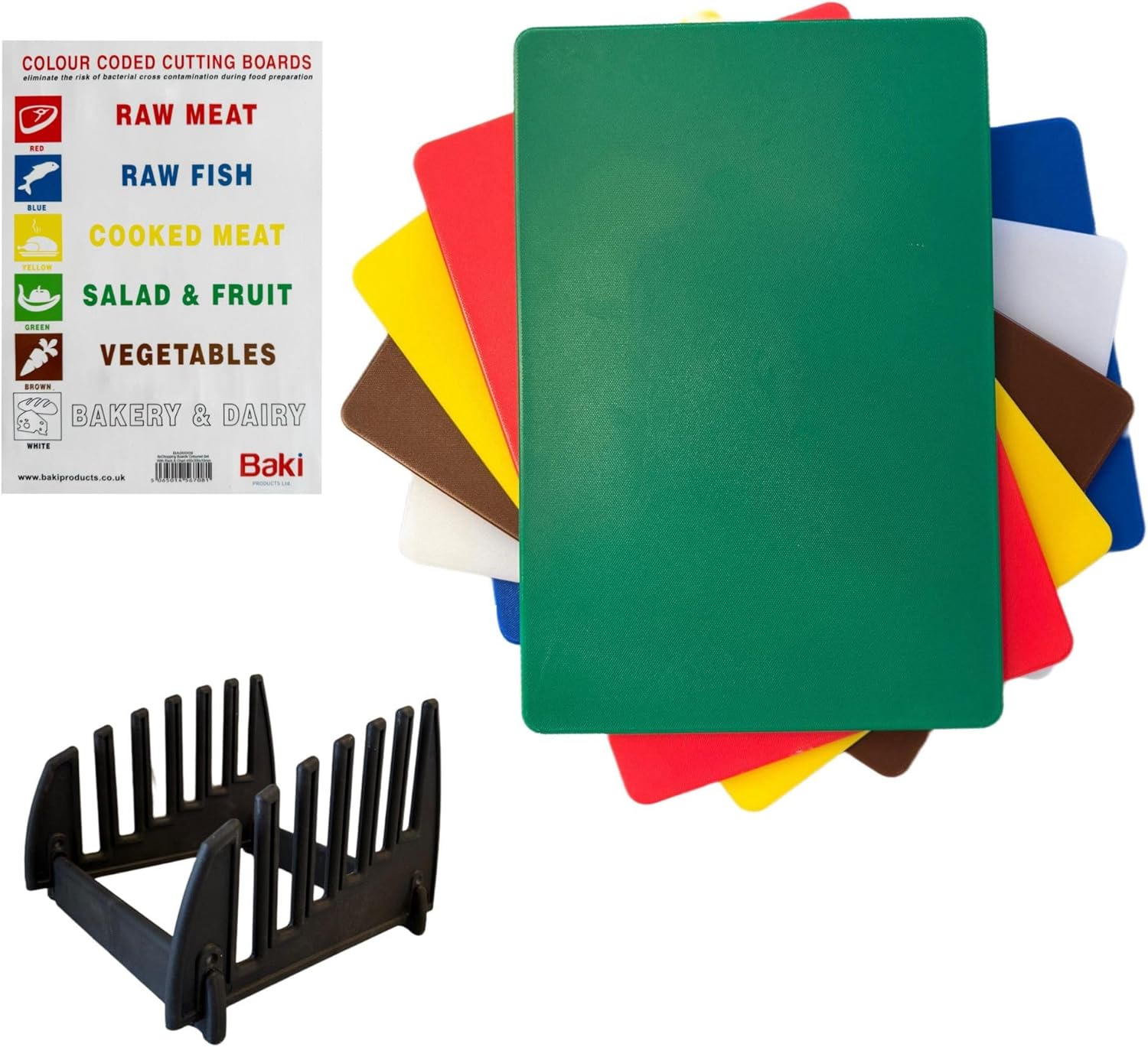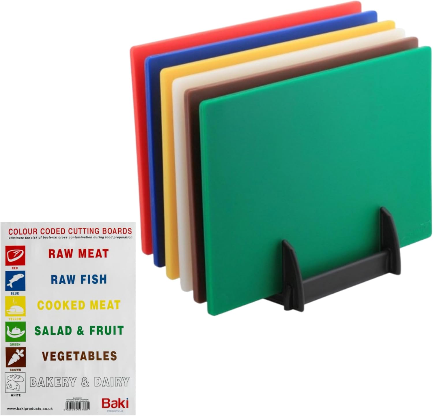 BAKI Professional Cutting Board for Kitchen/Restaurant, 45x30x1.1 cm Color-Coded(Set of 6) Plastic Chopping Board with and Without Rack (with Rack)