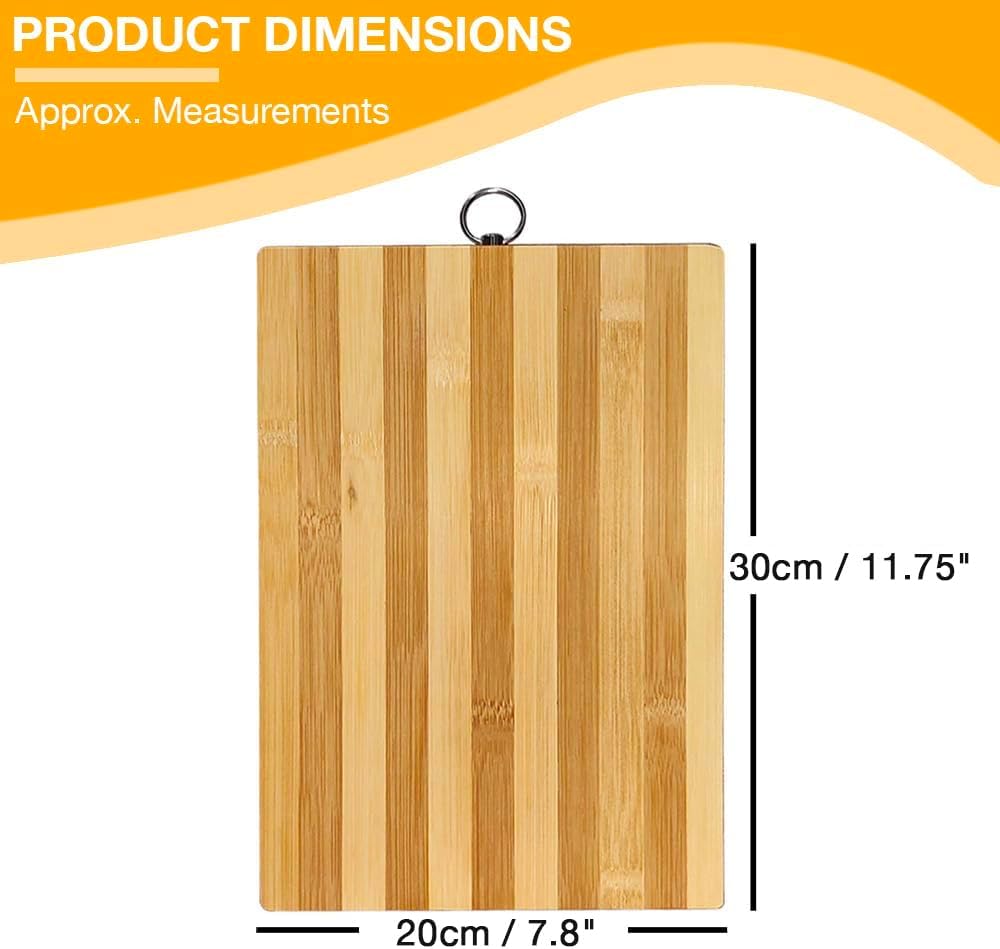 🔪🌿🥩🥕 INCLUDED IN THIS PACKAGE – One bamboo chopping board with a silver ring attachment for easy carrying or hanging. The chopping board measures approximately 32cm / 12.6″ x 22cm / 8.6″ and is made from strong bamboo. The board has been designed so that both professional and novice chefs can use it with ease