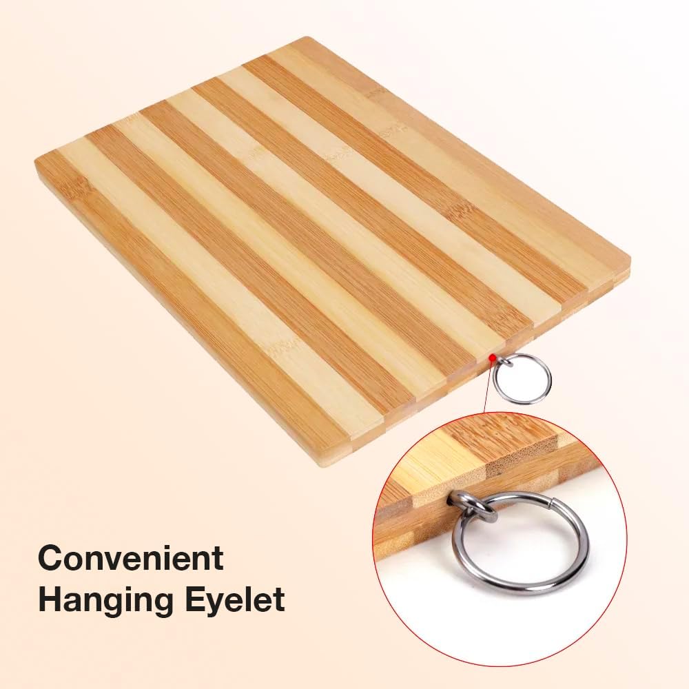🔪🌿🥩🥕 EASY TO CLEAN AND HANG UP – Cleaning this bamboo chopping board couldn’t be simpler. You need only wash it with warm water and soap after use. Ensure it is dried thoroughly and it can then be hung up from the useful ring attached to the board, this fantastic feature also ensures the board doesn’t take up valuable shelf or cupboard space
