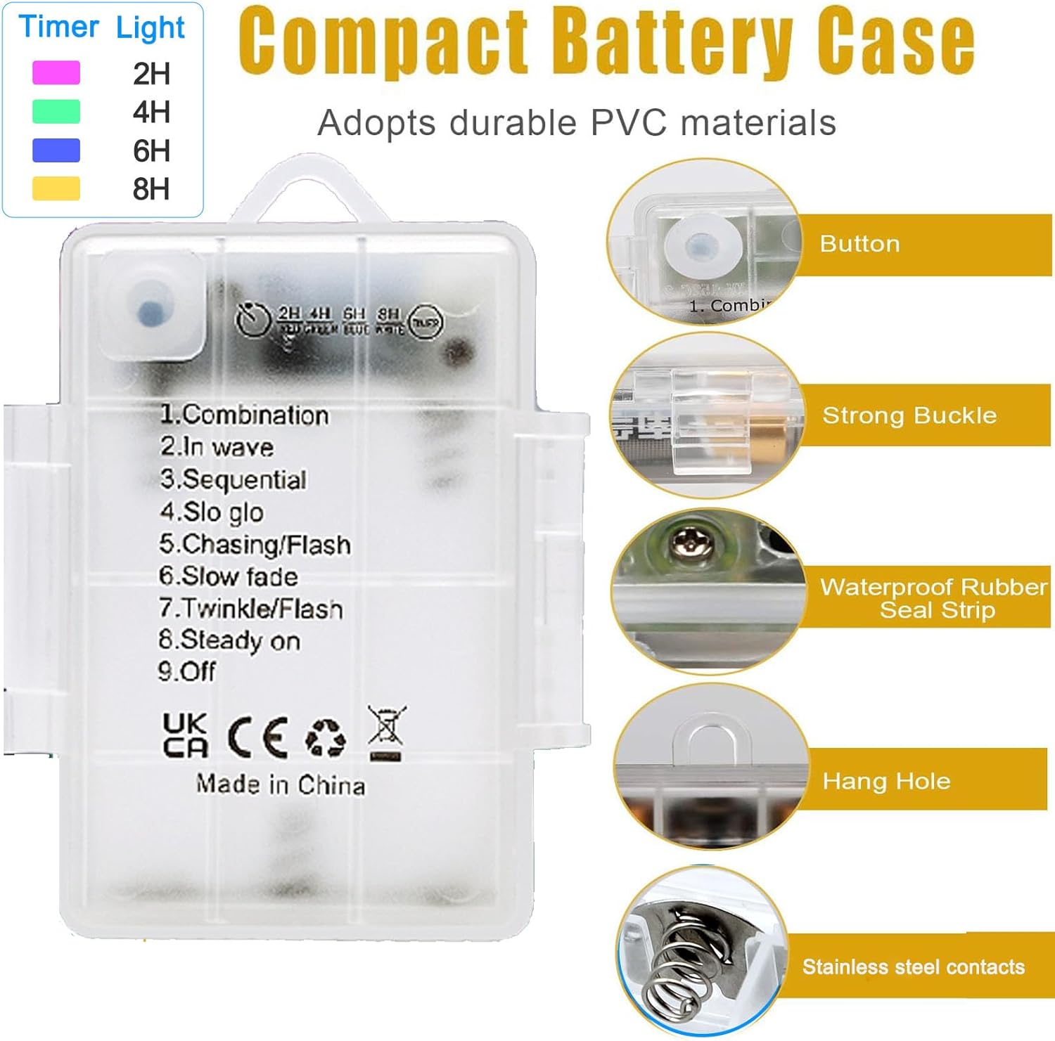 🎉WATERPROOF CHRISTMAS LIGHTS BATTERY OPERATED:Led fairy lights waterproof design is made of translucent plastic,after testing, the waterproof grade is higher than that of similar lights.transparent string cable extra safe(Battery case is not waterproof). This battery operated fairy light can create excellent illumination and a warming and romantic atmosphere at night.