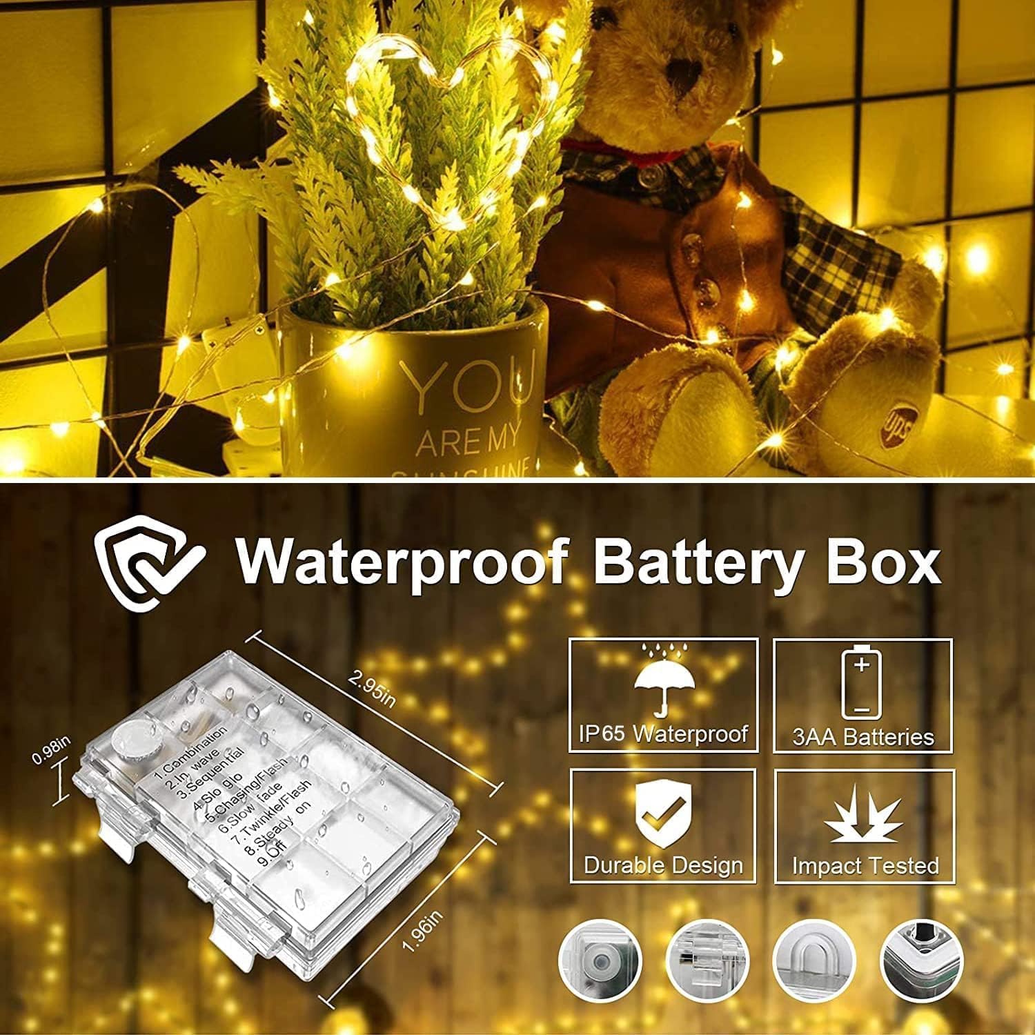 Waterproof & Portable: With IP65 water proof battery case you can easily set up your starry string lights anywhere, for indoor and outdoor use, Warm white lighting is ideal for your Christmas, Birthday party ,garden, wedding ceremony or girls bedroom, camping tent, wall decoration, bedroom, Creating a sweet and cozy ambiance.