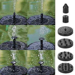 2021 upgraded solar fountain pump comes with 6 . 6 different nozzles allow you to change the shape, size and jet height of the water as you like, 4 anti-collision poles keep your solar water fountain in the center to save water – avoiding the water being sprayed out of the container. This small solar fountain attracts birds to paddle happily, making your garden more beautiful and dynamic.