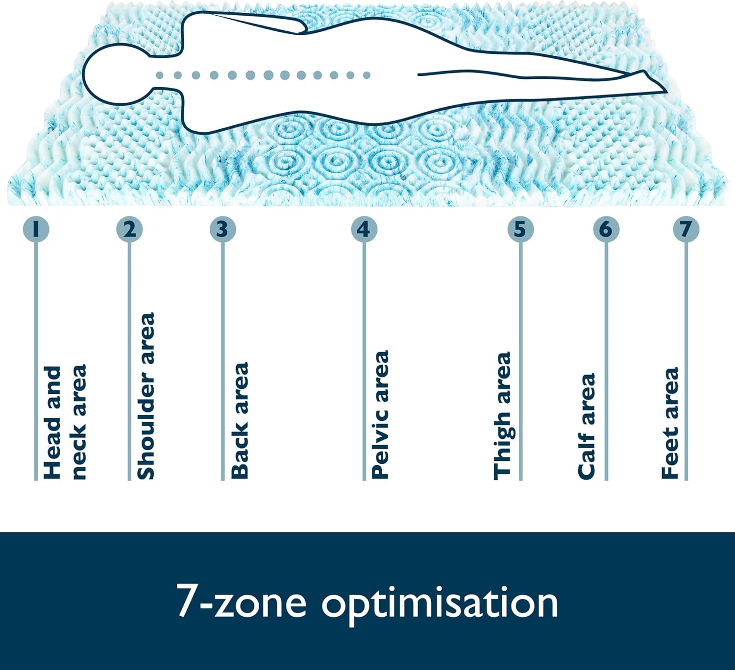 𝟳 𝗭𝗢𝗡𝗘 𝗠𝗘𝗠𝗢𝗥𝗬 𝗙𝗢𝗔𝗠 𝗠𝗔𝗧𝗧𝗥𝗘𝗦𝗦 𝗧𝗢𝗣𝗣𝗘𝗥 – 7-zone mattress topper with 7 cm high PU foam and removable quilted cover. Suitable for all sleep types with 7-zone design optimization. Promotes an ergonomic sleeping position and relieves pressure. Protects against moisture and wear.𝟳-𝗭𝗢𝗡𝗘 𝗗𝗘𝗦𝗜𝗚𝗡 – The 7-zone optimization of the bed topper provides ideal pressure relief in every body zone. The supporting layer adapts to your body for maximum sleeping comfort. The product bears the STANDARD 100 by OEKO-TEX label under test number SH025 193655 TESTEX.𝗔𝗡𝗧𝗜-𝗦𝗟𝗜𝗣 𝗖𝗢𝗔𝗧𝗜𝗡𝗚 – For mattresses up to 30 cm. The body zine mattress topper has four 2.5 cm corner elastics to comfortably attach the fitted cover to the mattress. The polyester cover has a non-slip coating on the underside for optimum grip.𝗕𝗥𝗘𝗔𝗧𝗛𝗔𝗕𝗟𝗘 𝗠𝗔𝗧𝗘𝗥𝗜𝗔𝗟 – The support layer of the memory foam bed topper ensures better air circulation and regulates moisture. The skin-friendly cover can be removed and washed at 40°C on a delicate cycle. 𝗙𝗢𝗥 𝗖𝗢𝗠𝗠𝗢𝗡 𝗠𝗔𝗧𝗧𝗥𝗘𝗦𝗦𝗘𝗦 – Unpack and roll out the mattress protector. Allow the product to air out and rest for 24-72 hours. Use the foam mattress topper for your box spring bed, common mattress, camping, guest bed or for your sofa.