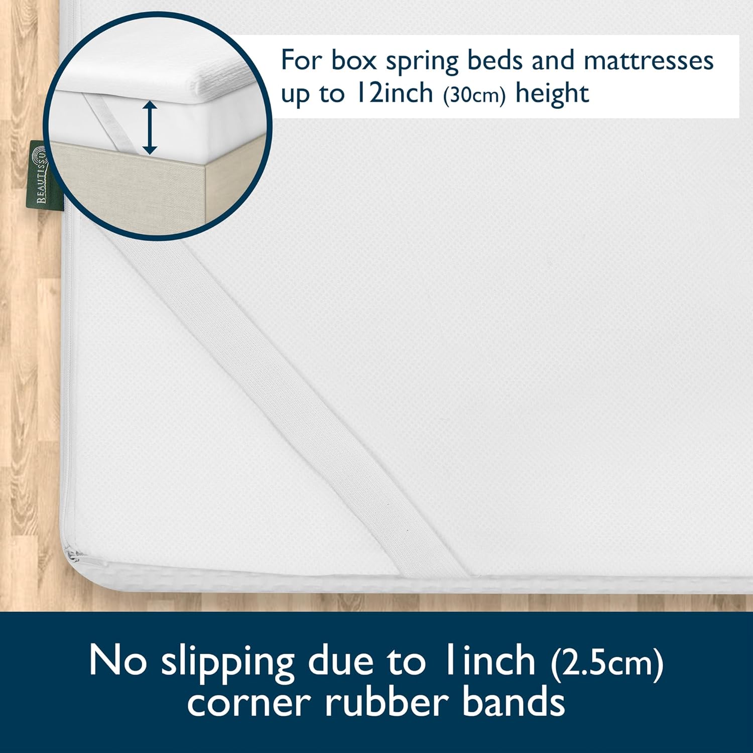 𝗔𝗡𝗧𝗜-𝗦𝗟𝗜𝗣 𝗖𝗢𝗔𝗧𝗜𝗡𝗚 – For mattresses up to 30 cm. The body zine mattress topper has four 2.5 cm corner elastics to comfortably attach the fitted cover to the mattress. The polyester cover has a non-slip coating on the underside for optimum grip.