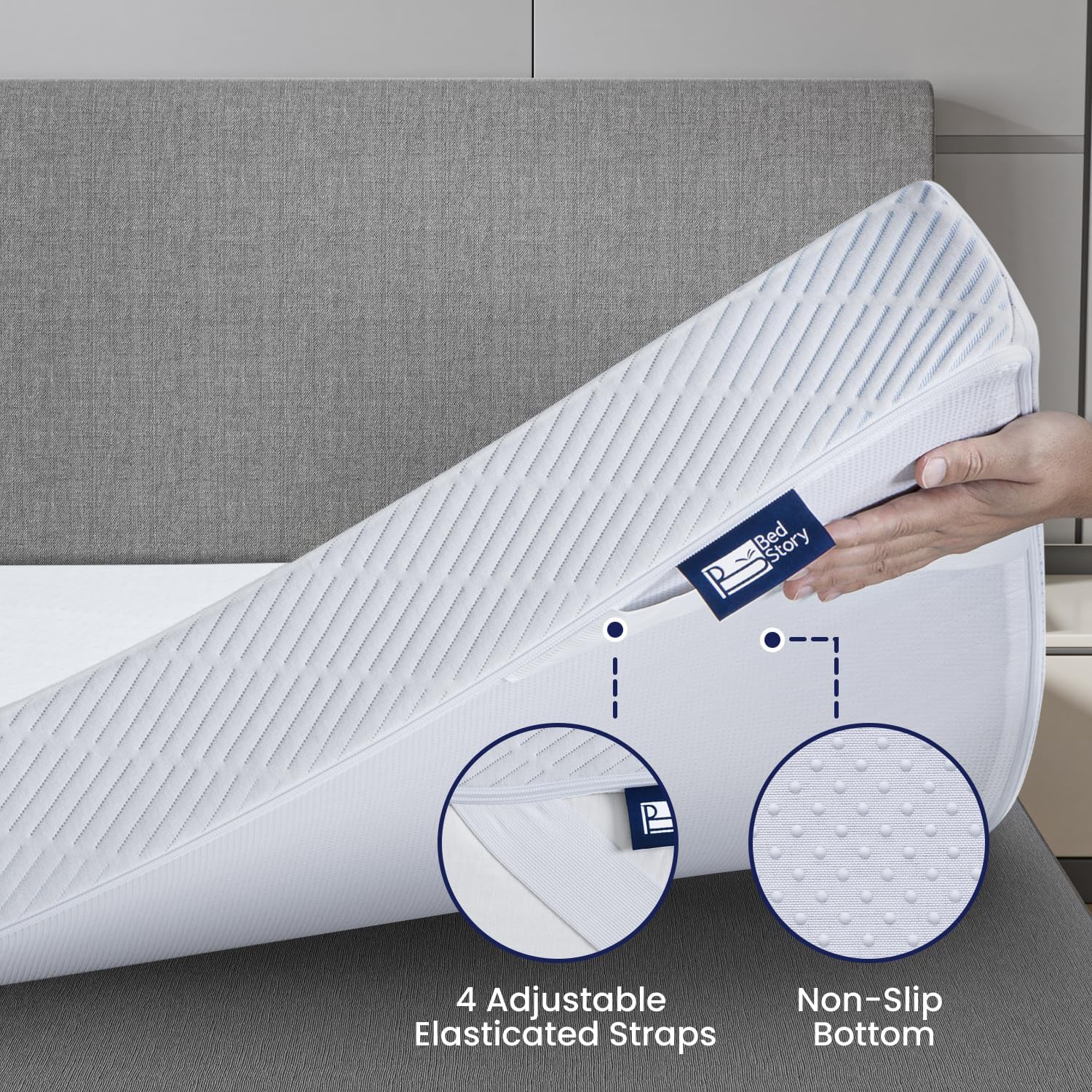 NON-SLIP DESIGN – BedStory Super king mattress topper comes with adjustable elasticated straps and a non-slip base. High quality zip for easy removal and jacket cleaning.