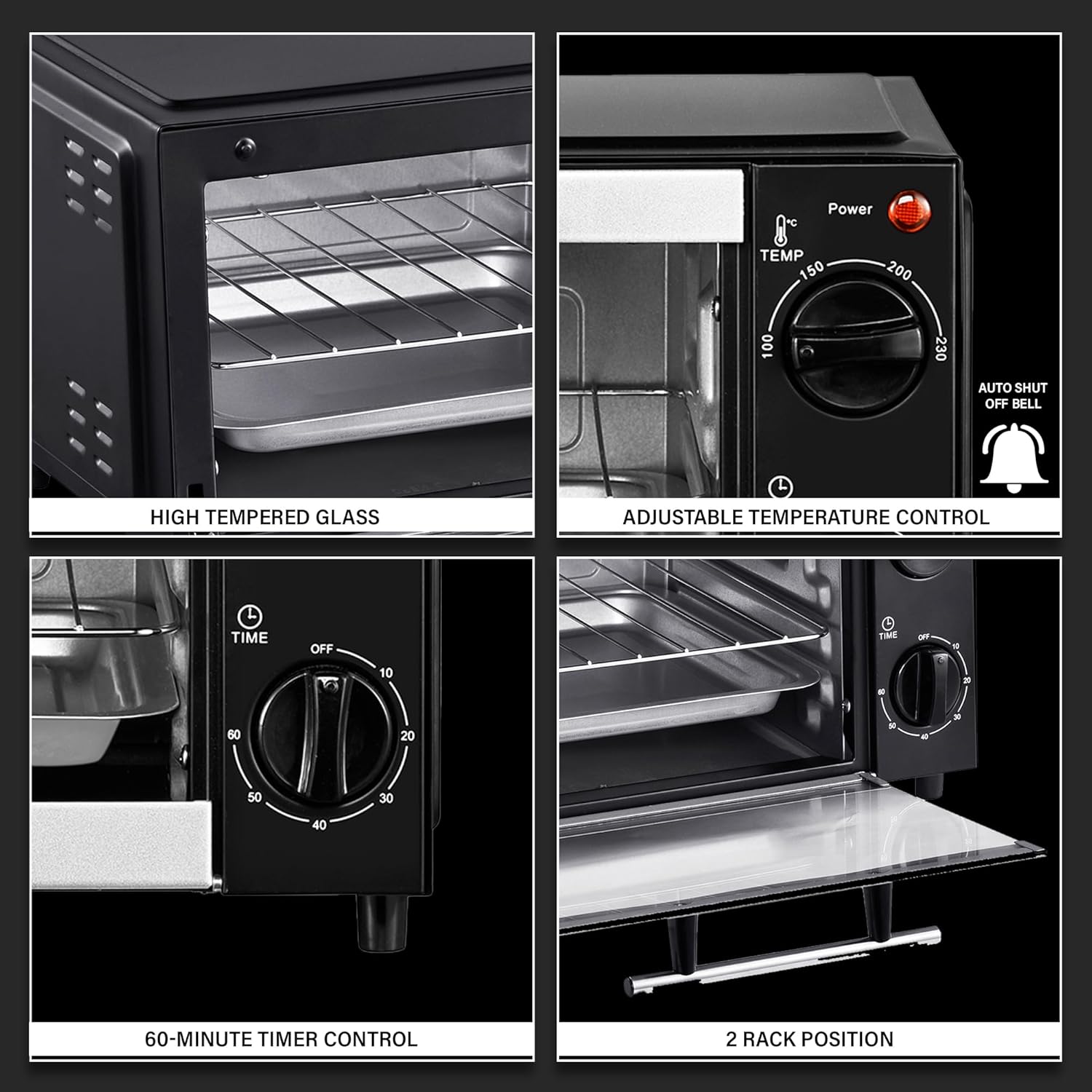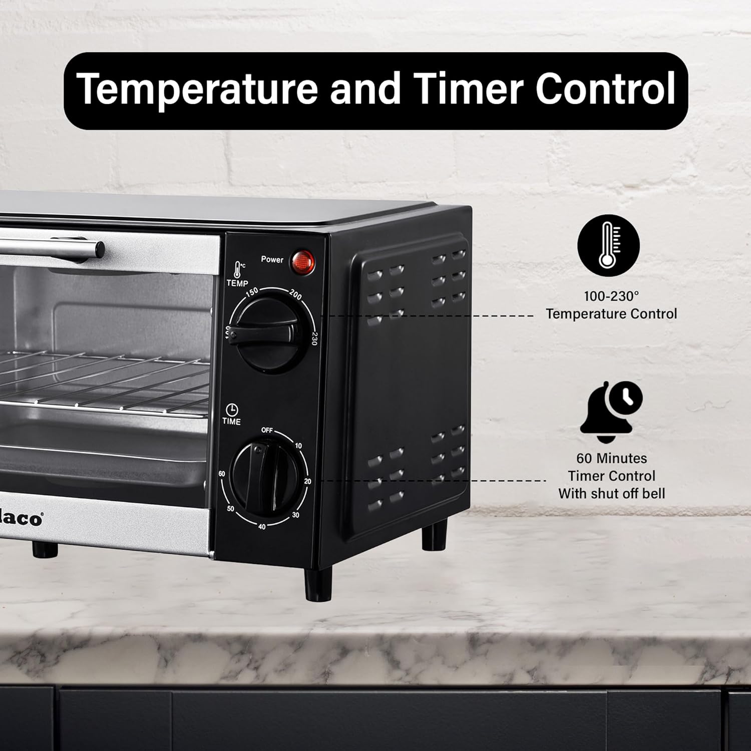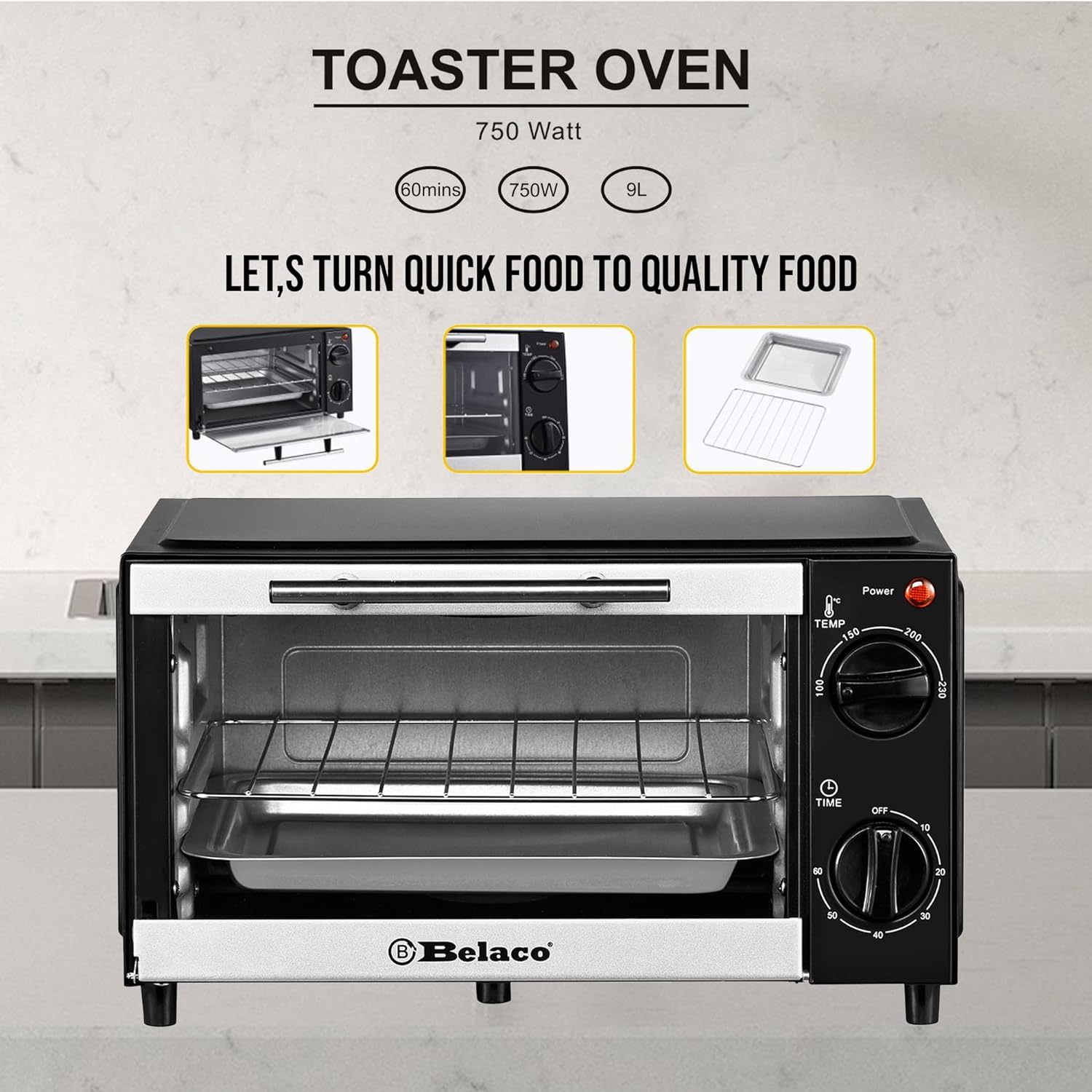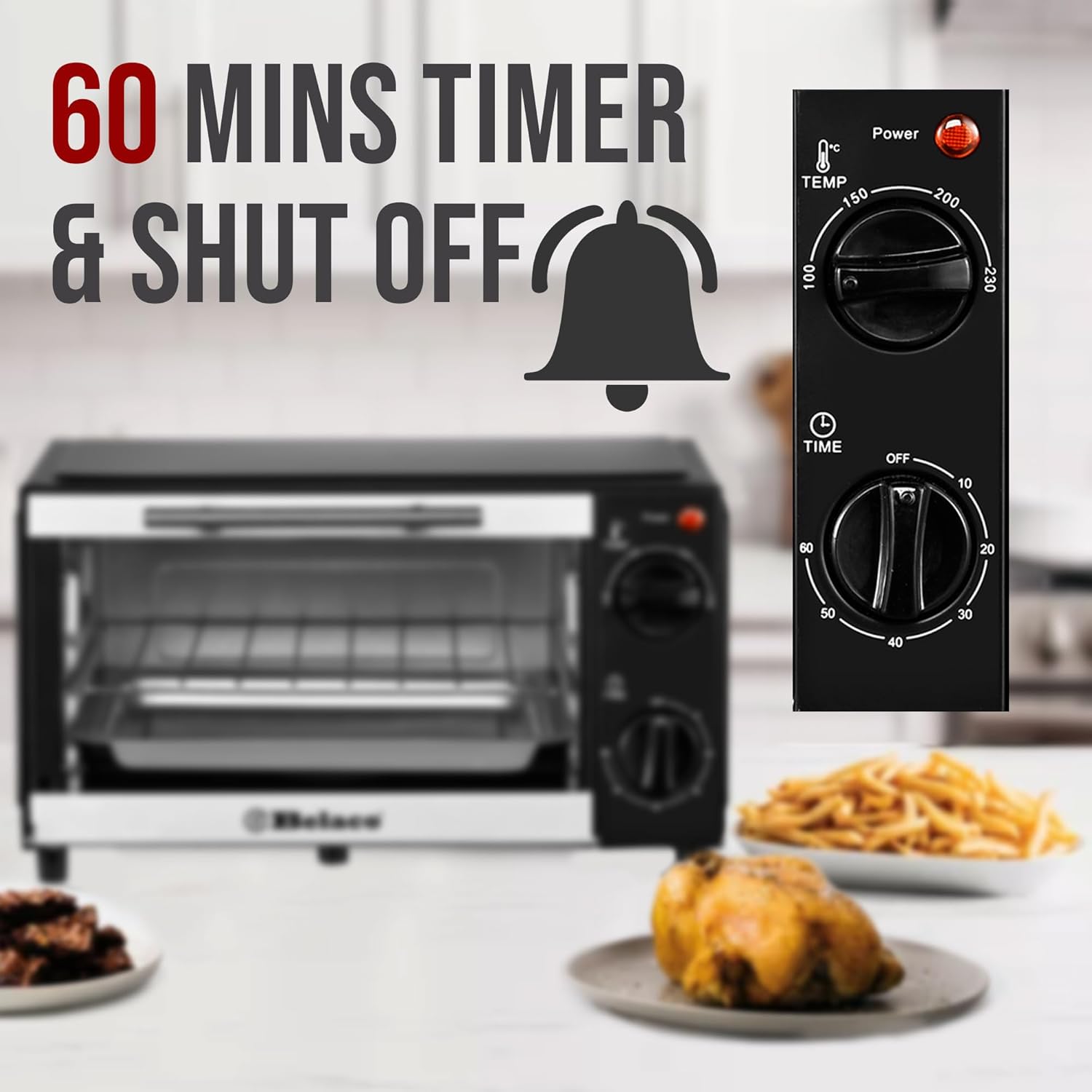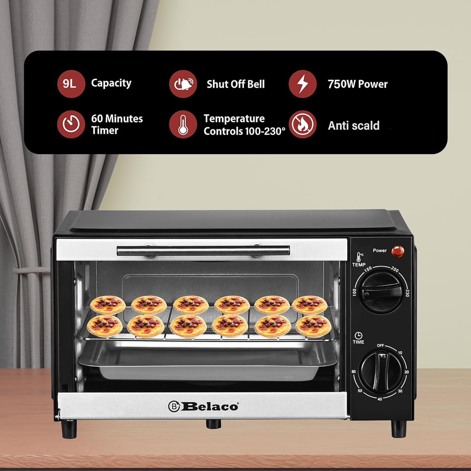 Belaco BTO-109N Mini 9L Toaster Oven Tabletop Cooking Baking Portable Oven 750w 60 min Timer 100-230° Stainless Steel Heating Tube incl. Baking Tray & Wire Rack