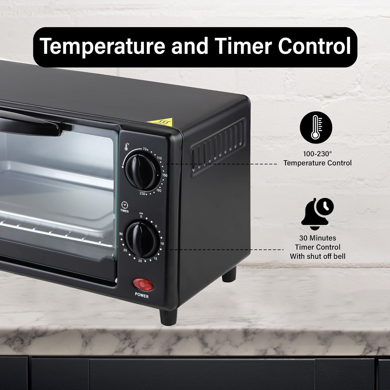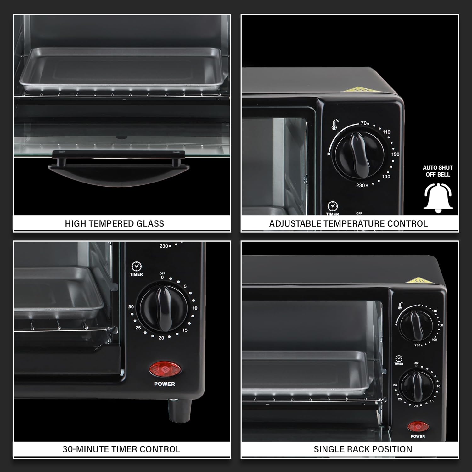 30 MINUTES TIMER 80-230°C TEMPERATURE RANGE COMPACT TABLETOP OVEN NON-SLIP FEET 650W HIGH WATT EFFICIENT & ENGERY SAVING AUTOMATIC SHUT OFF EFFORTLESSLY CLEANING