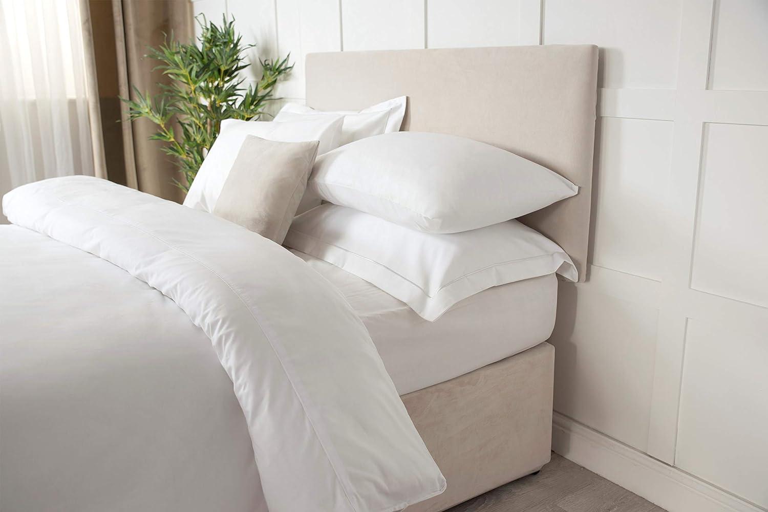 I wasnât sure what to expect or even what size to order because I have a small double tall headboard but I knew I could return if it wasnât right. A doddle to put on and the double size I ordered fits perfectly. A classy suede effect fabric and the shade linen is a cool neutral beige colour. Such a simple design which makes a massive difference to the look of my bed Iâm really pleased.