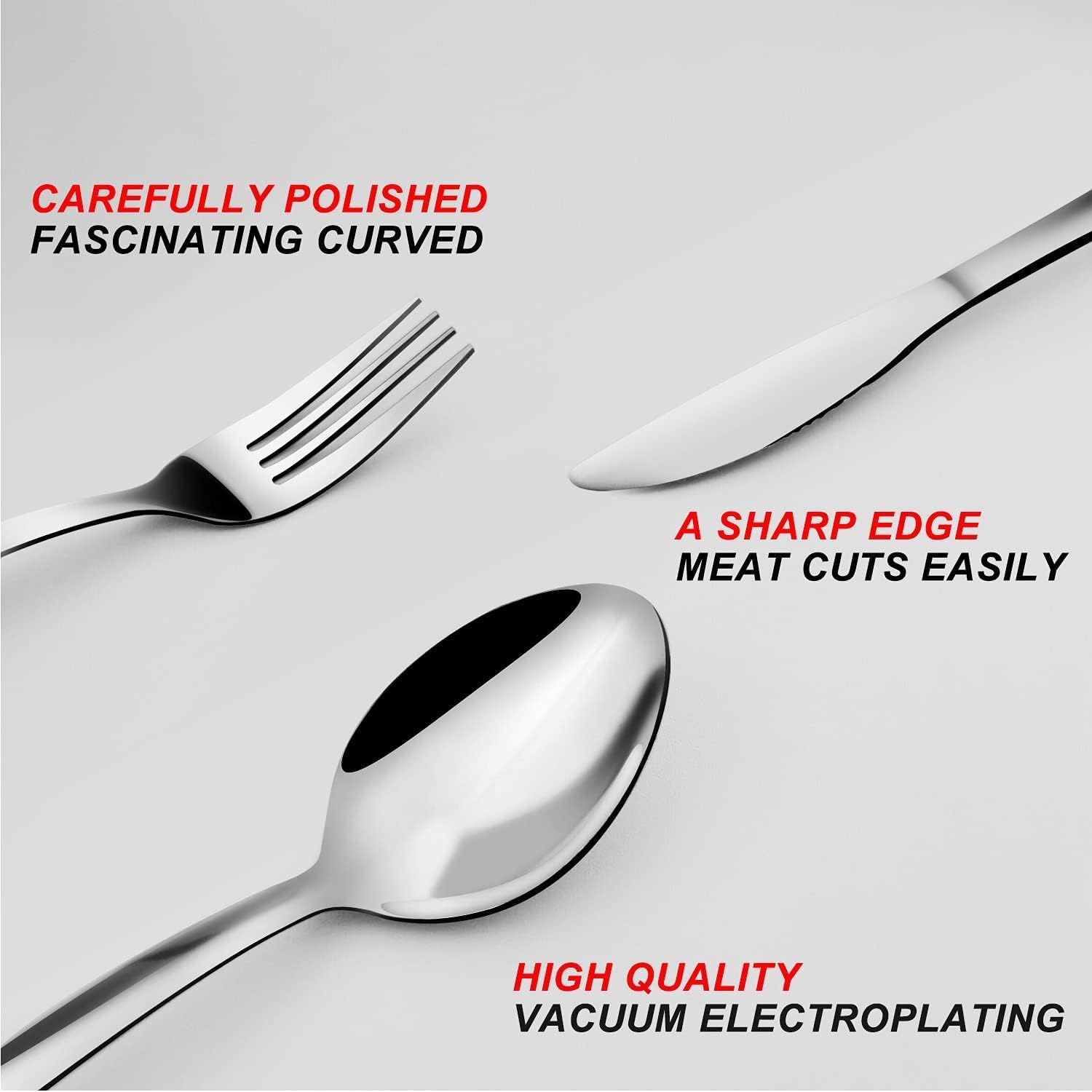 【Comfortable-Handle】There is a unique micro-recess design on the handle that perfectly fits to the shape of the finger, which makes the grip more comfortable. Polished design without rough spots that this forks knives and spoons set will not hurt your mouth in your daily life.