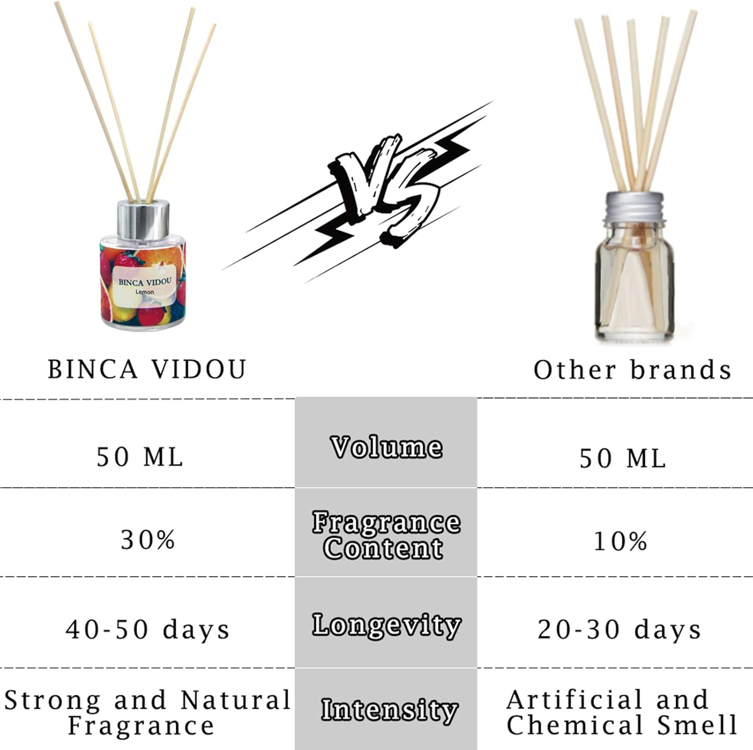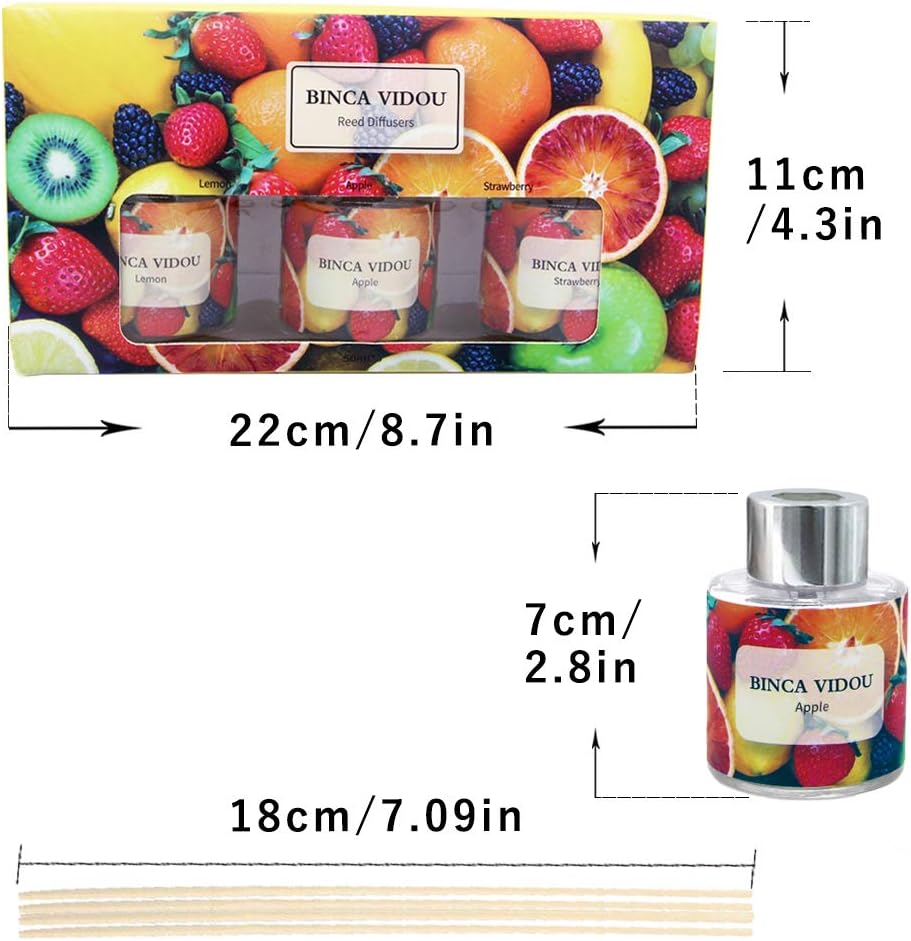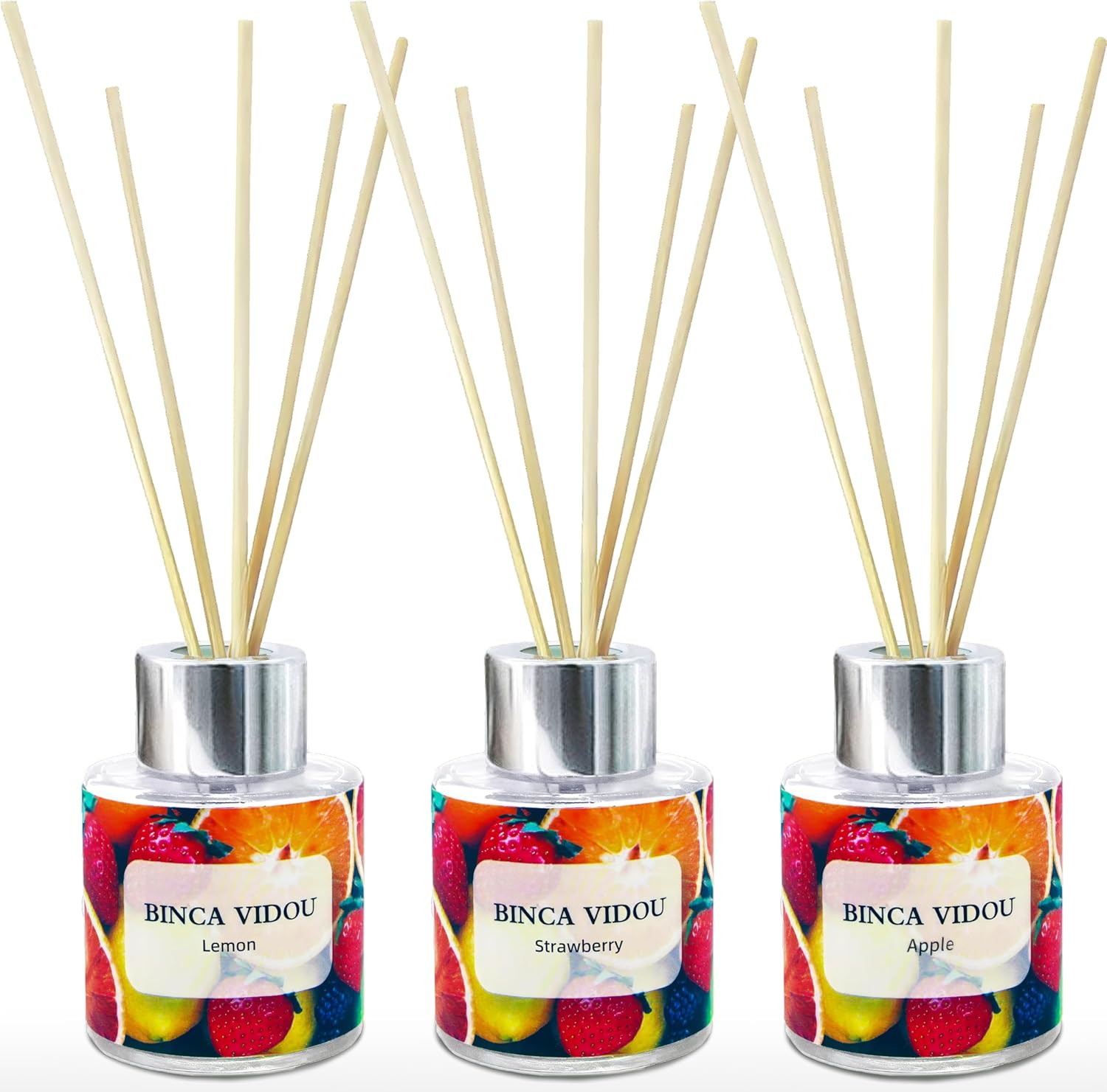 binca vidou Reed Diffuser 50ml Pack of 3 – Lemon Apple Strawberry Scented Oil Reed Diffuser Set with 12 Sticks – 50 Days Lasting & Strong Aroma – Home Fragrance Diffuser for Bedroom Bathroom Office