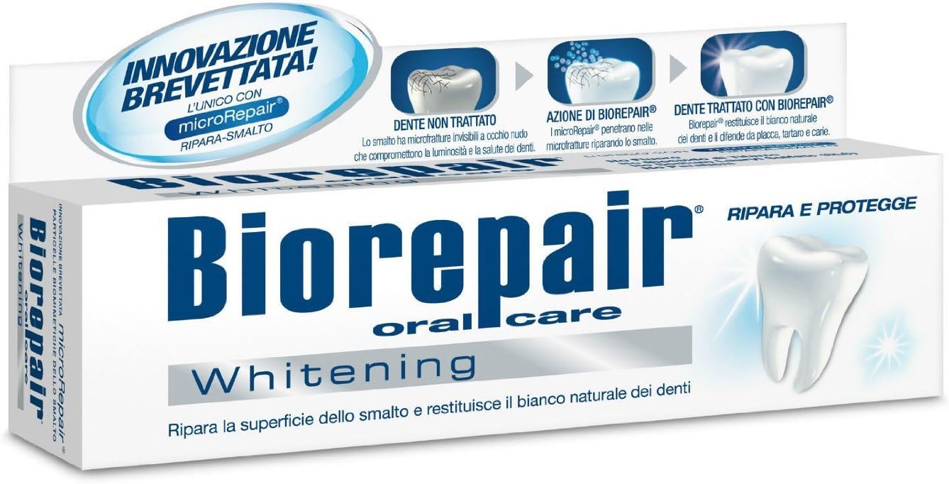 (as of [price_update_date] – Details2pcs Toothpaste 75ML new improved updated in white and red box – you will glad you purchase product **** save on dentist visit****** i recommend due to personal use. The only toothpaste based MicroRepair , which restores the tooth enamel and bleaches naturally. Interaction between remineralizatsionnoto action MicroRepair and bleaching effect of PVP polymer ensures natural and healthy white. When you brush your teeth with Biorepair, microRepair microparticles of hydroxyapatite are released. Hydroxyapatite is virtually identical to enamel and that’s what makes Biorepair such an effective enamel repairing toothpaste. These microRepair microparticles are so small, they can get into the tiny cracks and crevices on the surface of your teeth often caused by acid erosion. They then fill in the cracks and bind to the enamel – actively repairing tooth enamel.Repairing tooth enamel The microRepair microparticles act on tooth enamel by filling in microscopic fissures, scratches and surface enamel lesions, smoothing out any roughness and repairing the surface, making the tooth look more radiant. Preventing decay By filling in the tiny holes to repair the damaged enamel surface, the microRepair microparticles help to prevent plaque and bacteria from forming and leading to more serious damage such as tooth decay. Reducing sensitivity The microRepair microparticles strongly bind to the tooth enamel and fill in the tiny holes, forming a protective layer over any exposed nerve endings. This gives effective long-term relief from dental sensitivity.