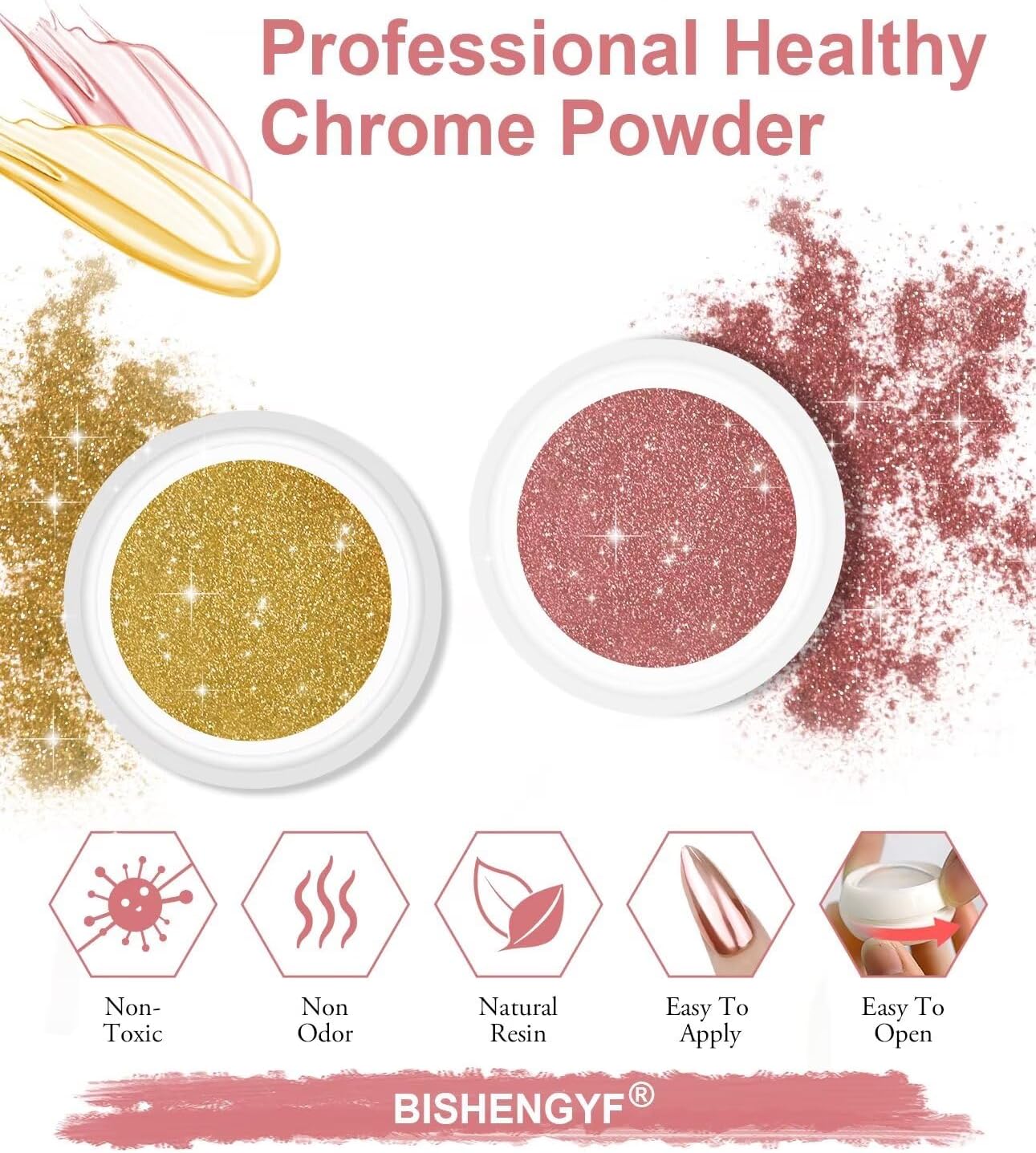 BISHENGYF Rose Gold Chrome Nail Powder【2024 Upgrade】 Metallic Holo Nail Chrome Powder【Super Mirror Effect】Shiny Nail Glitter Powder with Magic Mirror Effect for Nail Art Design Decoration