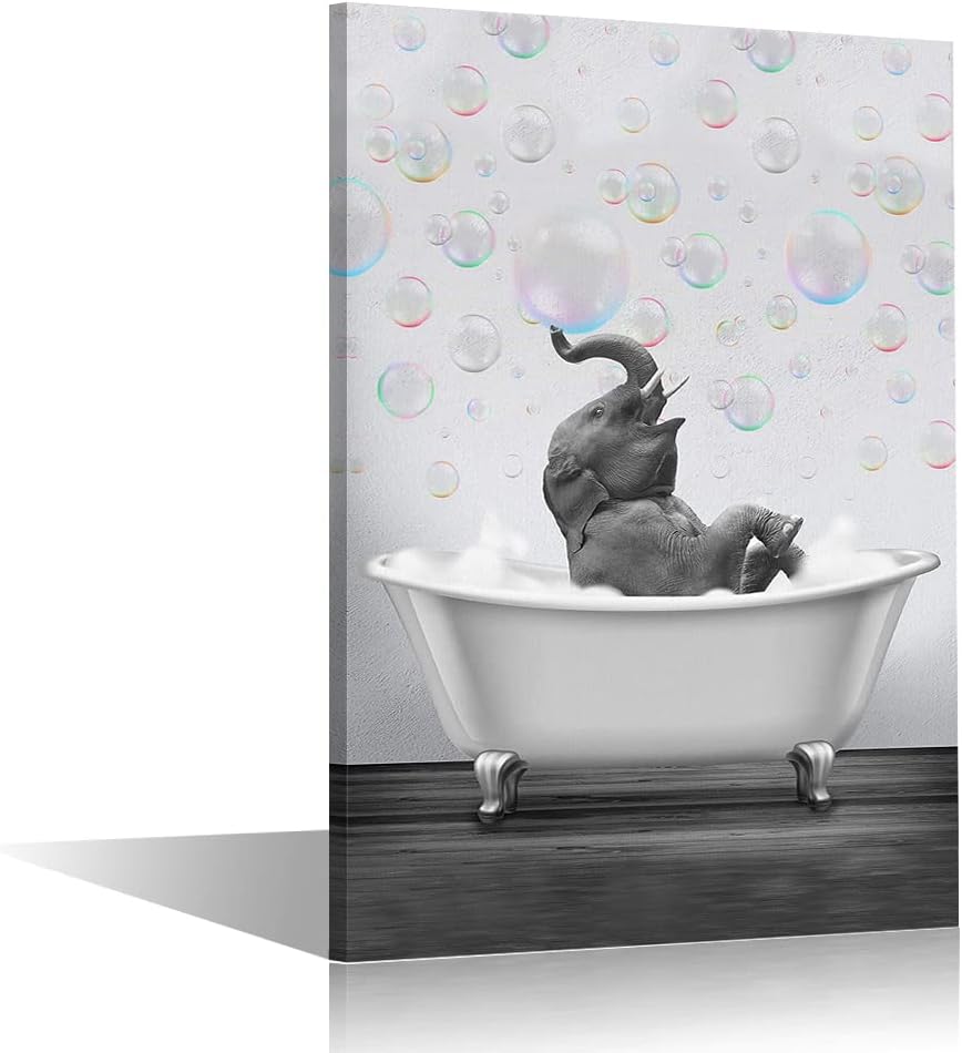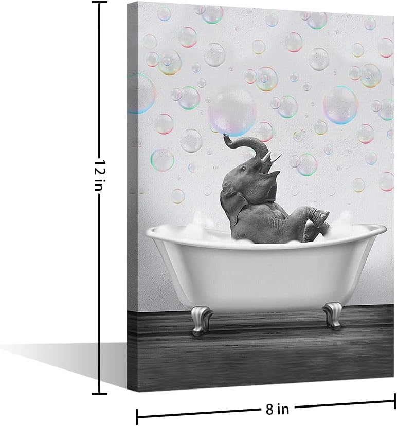 Black and White Wall Art Cute Elephant in The Bathtub Print Poster Canvas Paintings for Bathroom Living Room Bedroom Decor Kid’s Room Wall Decoration (8x12inch/20x30cm Frame)