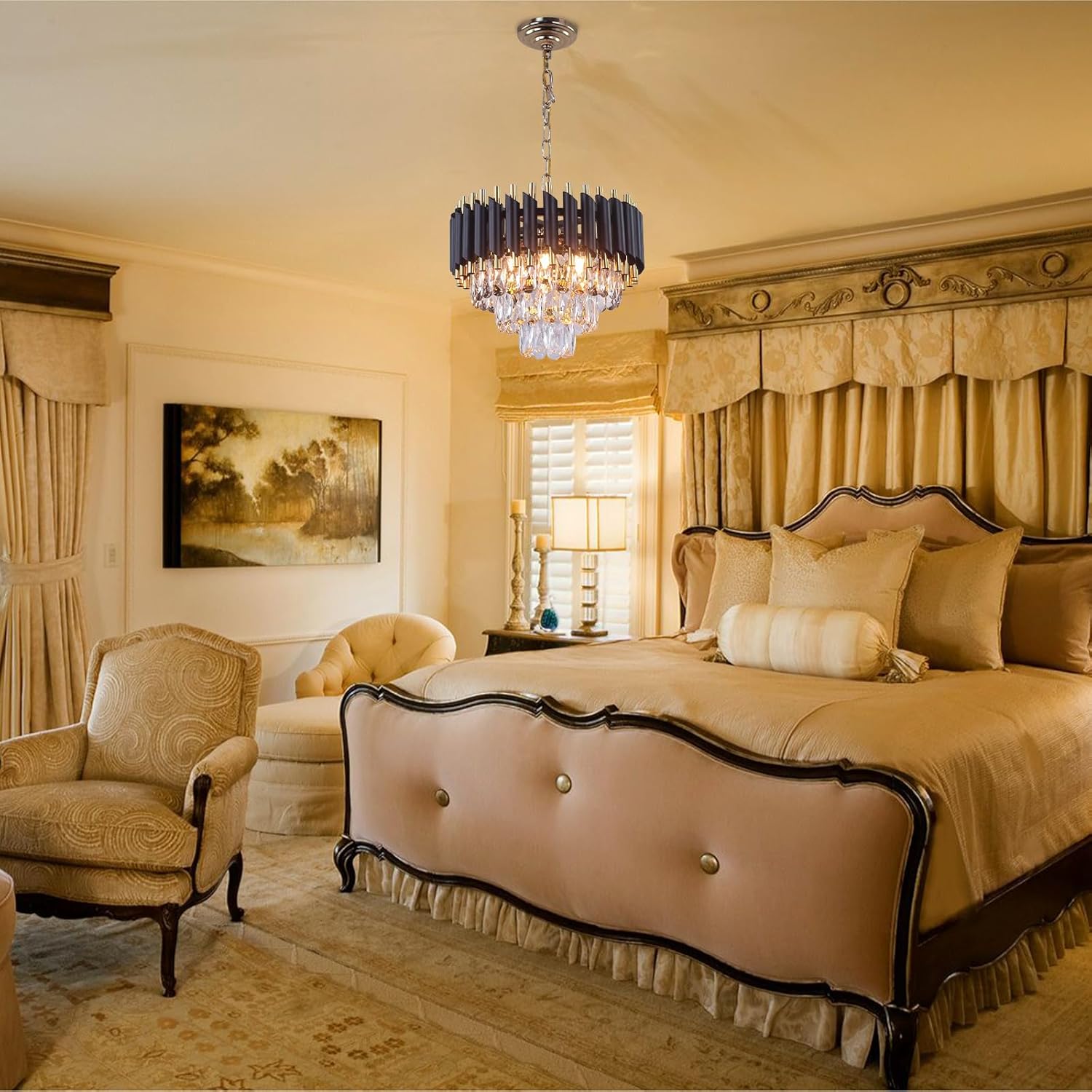 Chandelier Size: D40CMxH31CM.Ceiling base :15CM.Chain Length 60CM(Adjustable Chain).Please ensure dimensions of this crystal chandelier light fixture is fit for your prepared space or not.