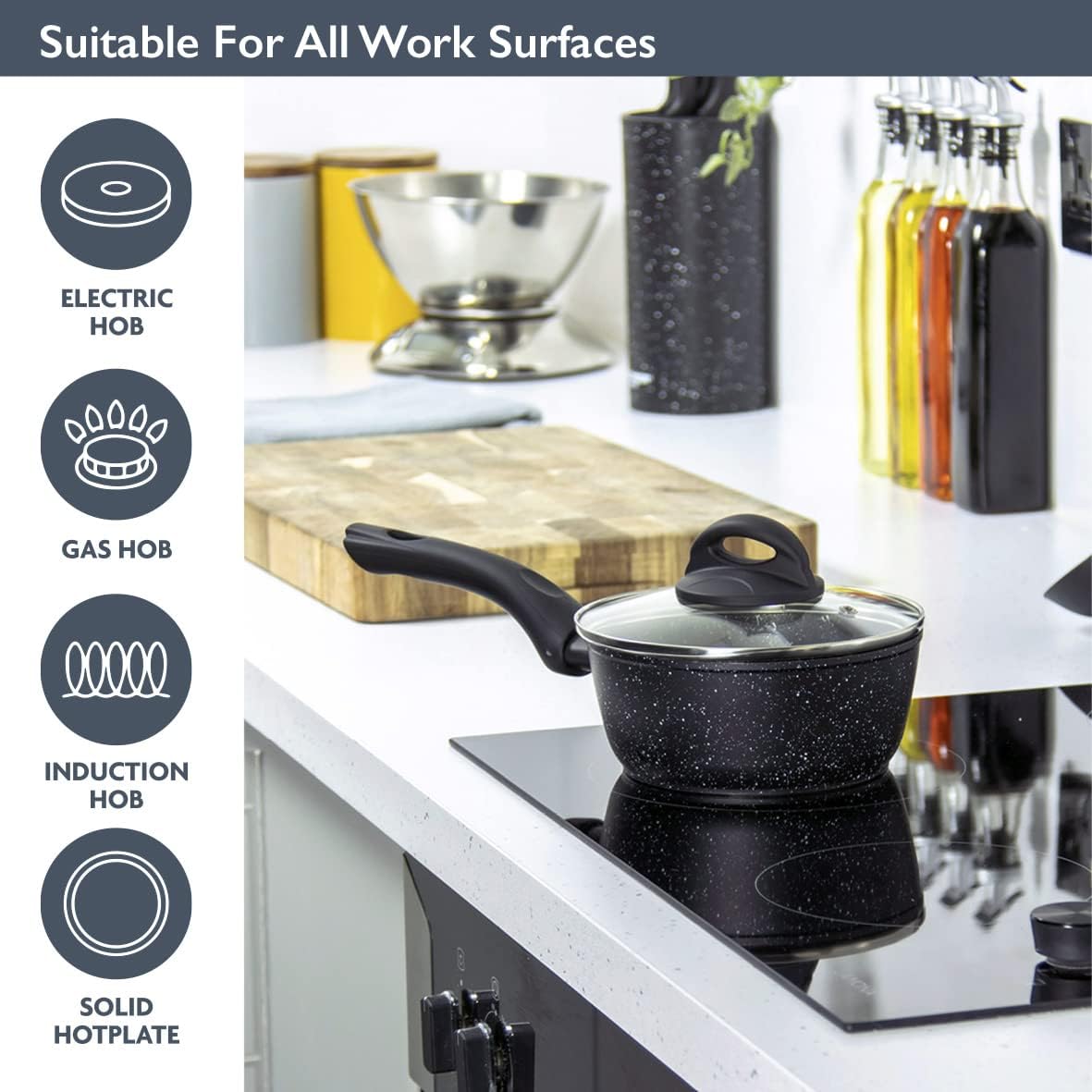 SUITABLE FOR ALL HOB TYPES – This saucepot is suitable to be used on all hob types such as gas, electric, induction, and even on hot plates too. The pan comes in a stylish black marble effect colour, ensuring it looks the part in any style of kitchen.