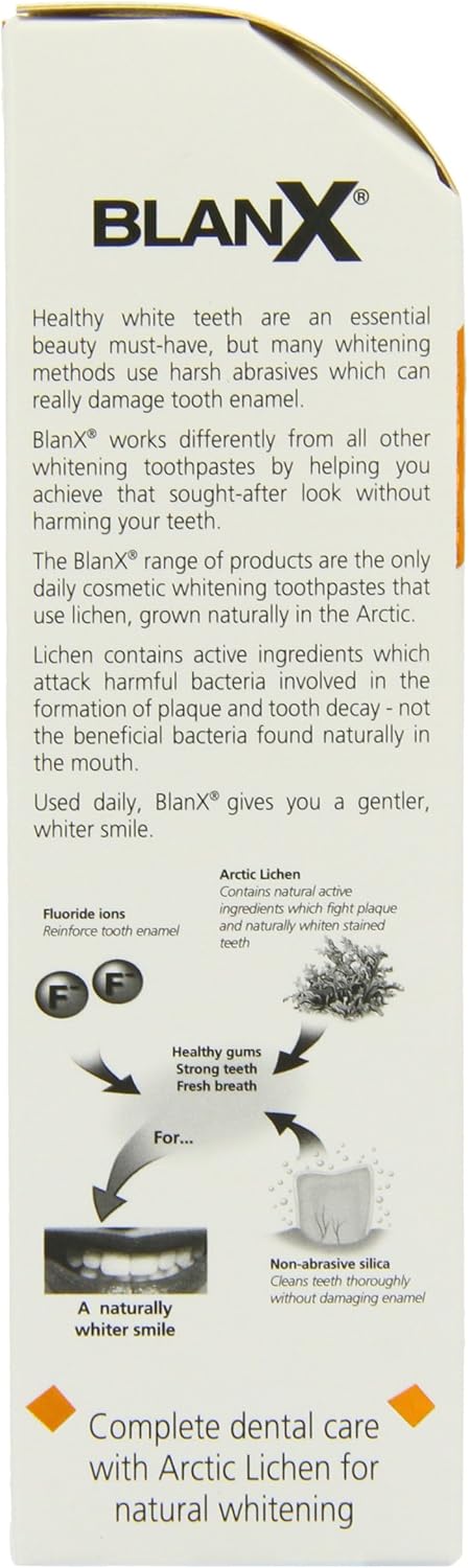 “BlanX Intensive Stain Remover effectively removes stubborn stains caused by smoke, food, drink & plaque and is specially designed to restore the natural whiteness of the teeth. White teeth have always been an essential beauty must have but many whitening methods use harsh abrasives which can damage the tooth enamel. BlanX is the only natural cosmetic toothpaste with an international patent that contains Arctic Lichens which restores the teeth’s natural whiteness. Non-abrasive, peroxide free and gentle on enamel makes BlanX suitable to use daily to give you a healthier whiter smile. Brush thoroughly for 2 minutes, twice a day.”
