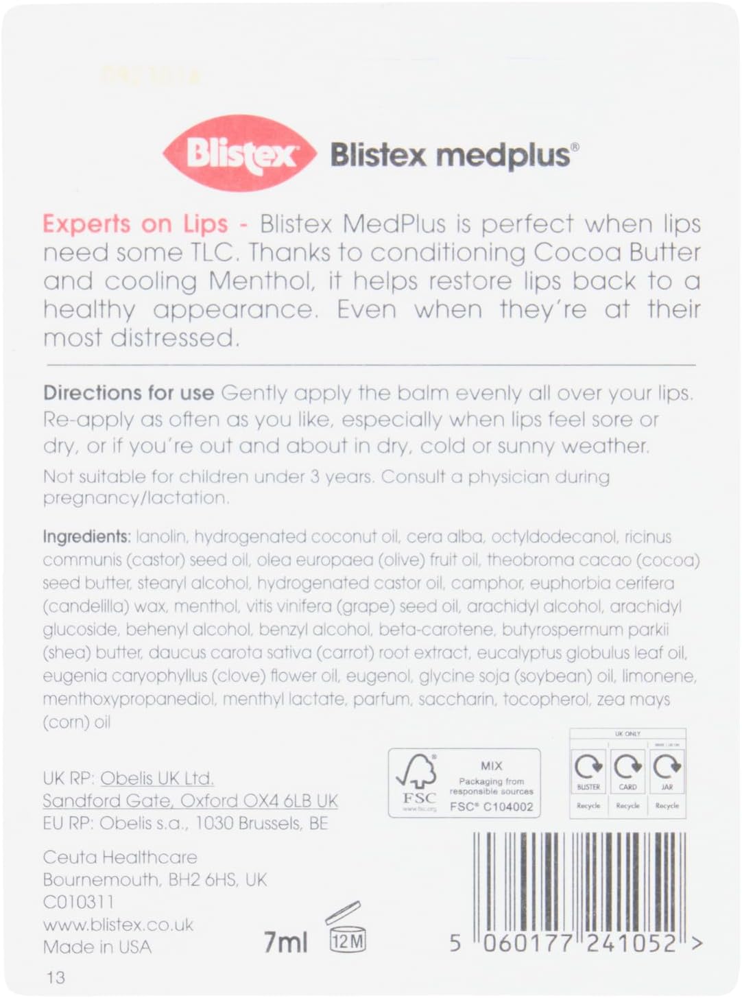 Blistex MedPlus is perfect when lips need some TLC. Thanks to conditioning Cocoa Butter and cooling Menthol, it helps restore lips back to a healthy appearance. Even when they’re at their most distressed. Directions for use: Gently apply the balm evenly all over your lips. Re-apply as often as you like, especially when lips feel sore or dry, or if you’re out and about in dry, cold or sunny weather.