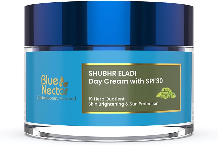 Blue Nectar Natural Face Moisturizer With SPF 30, Ayurvedic Brightening Day Face Cream for Skin Glow with Eladi Kumkumadi,Turmeric and Almond (Women, 19 Herbs, 1.7 Oz)