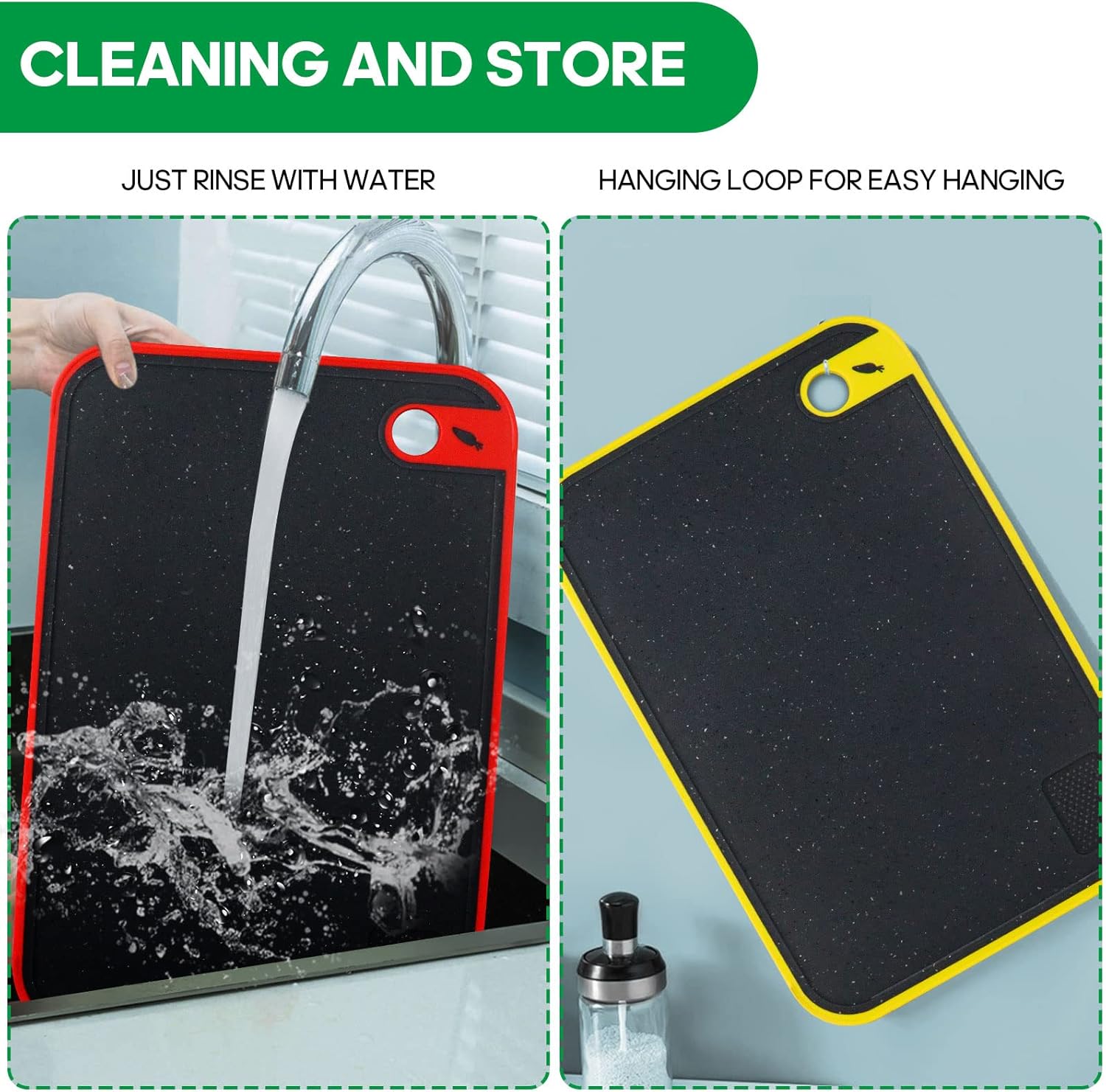 🥝【NON-SLIP AND GOOD GRIP】Chopping boards for kitchens have non-slip silicone edge and easy-grip handle, making them safer for you to cut on. The cutting boards have non-slip silicone corners to keep it on the countertop when chopping. Non-slip trim will provide a perfectly stable and safe cutting surface. You can now slice, chop, and dice with the confidence of a professional chef! Each cutting board is comfortable to hold and easy to grip with a finger or two.