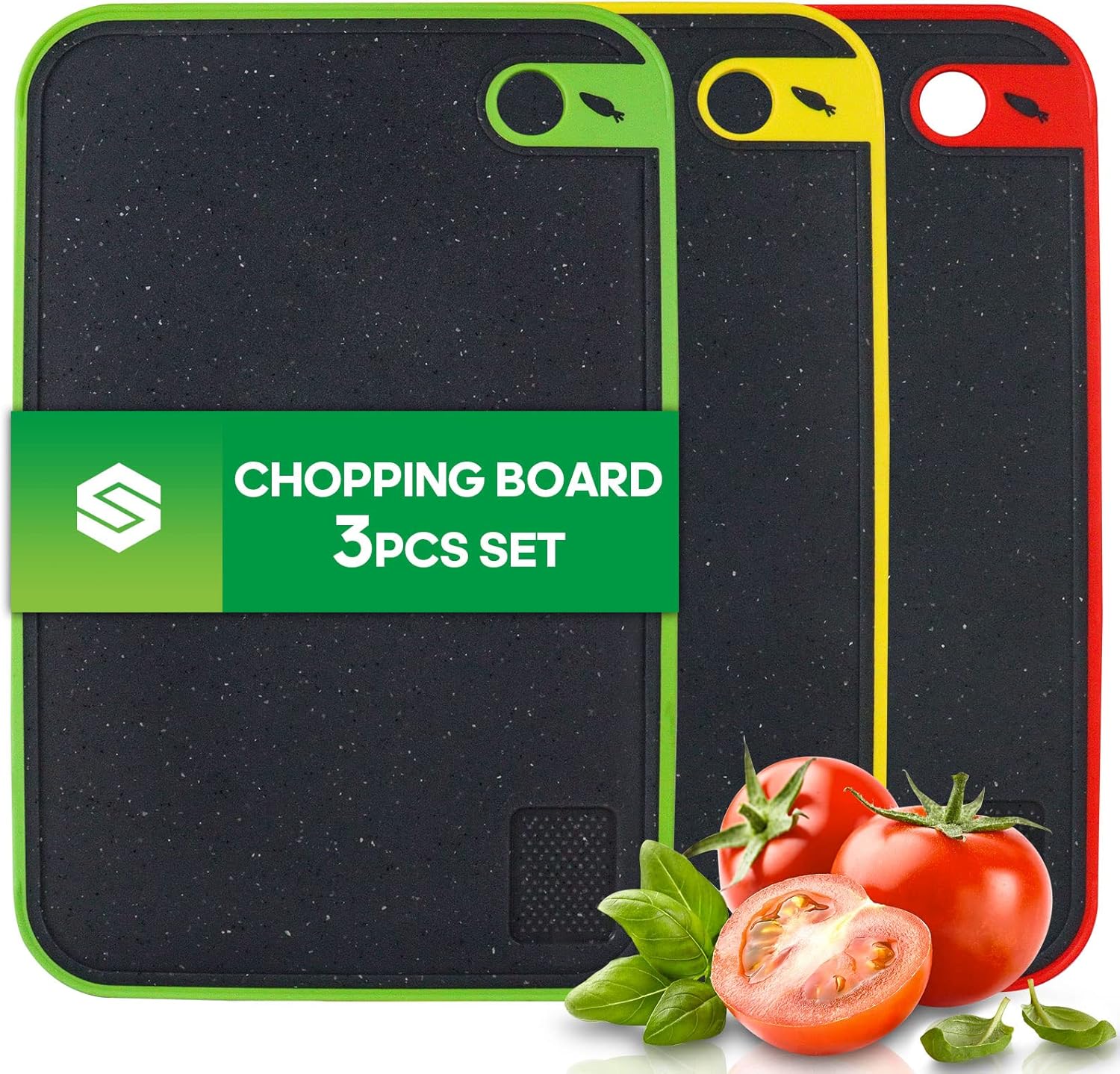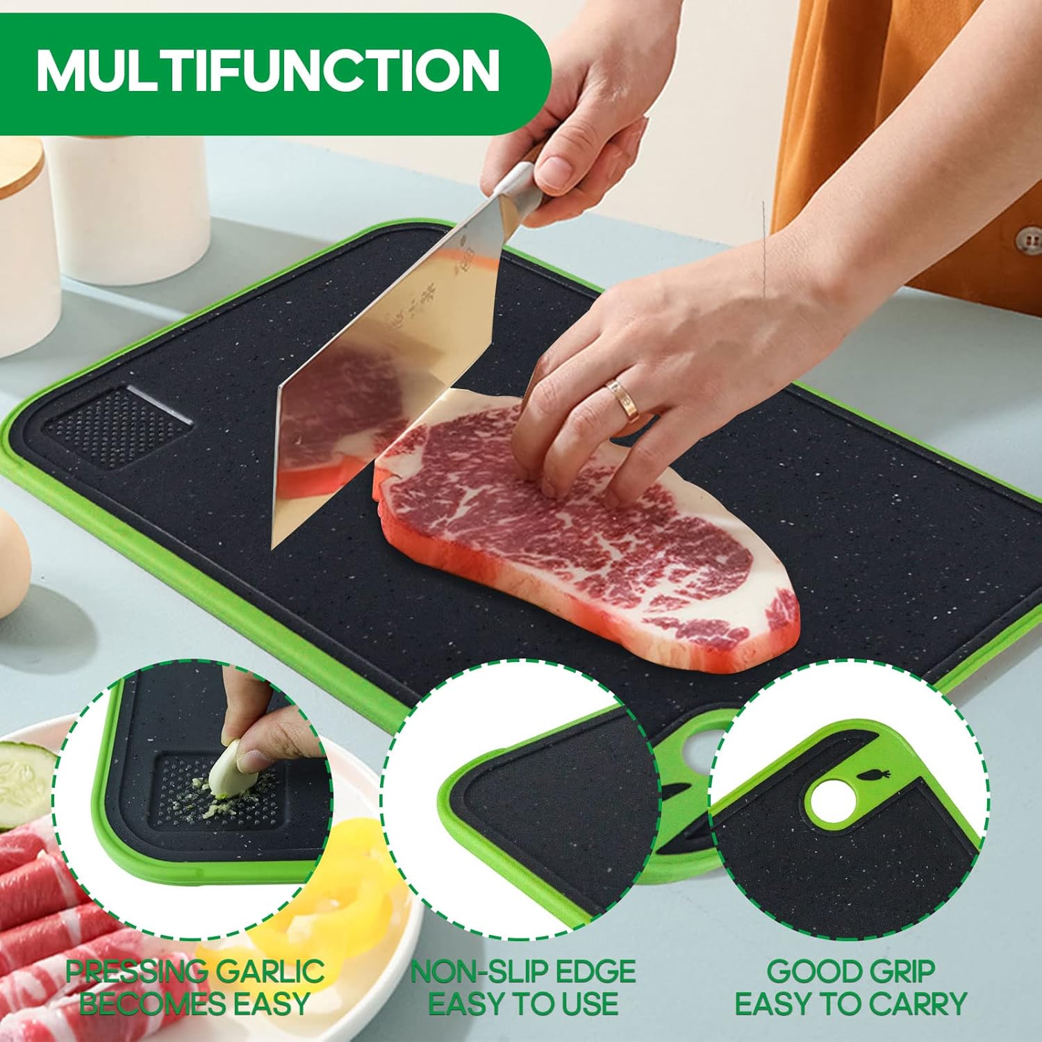 🥝【PROFESSIONAL CUTTING BOARD SET】The chopping board set is made of food-grade and high-density PP material. Which provides a solid and durable cutting surface enough to withstand heavy chopping, slicing, and dicing while also won’t dull or harming knives. Besides, the large chopping board measures 35 x 23CM and 0.3 inches thick, is BPA-free and certified by SGS and FDA, can be used for a long time, and is perfect to meet all your kitchen needs!