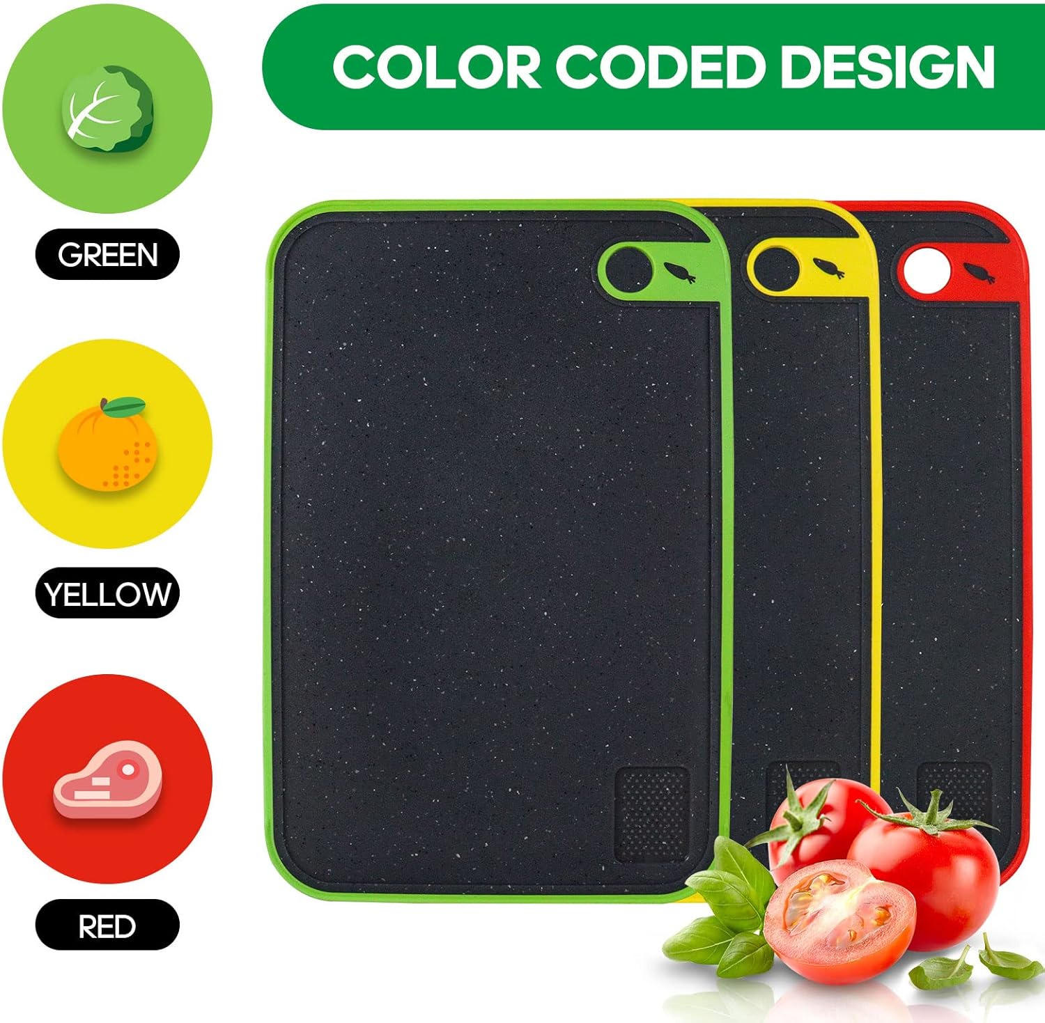 Different neutral colors and index of chopping board with different uses making kitchen cutting board more sanitary and preventing cross-contamination.You need this color-coded cutting board set to cut raw and cooked food separatly. And these chopping board sets are ideal for child food preparing.From now on, choose a healthier and more hygienic kitchen chopping board!3 colored cutting boards with unique food icon for different food, keep hygienic and original taste of food.