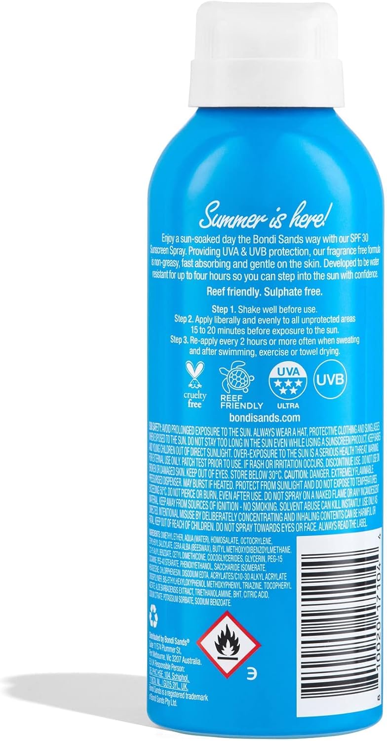 ABOUT THE PRODUCT: Enjoy a sun-soaked day the Bondi Sands way with our Fragrance Free Sunscreen Aerosol Mist SPF 30. Our broad-spectrum formula is non-greasy, water resistant for up to 4 hours, and leaves your skin feeling moisturised and protected so you can step into the sun with confidence. Our Fragrance Free Sunscreen Aerosol Mist SPF 30 is perfect for all skin types.